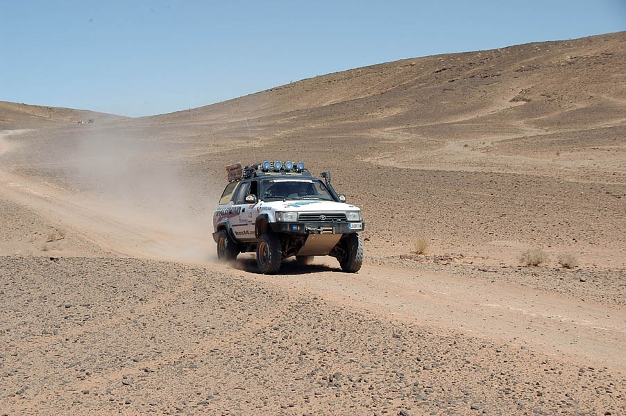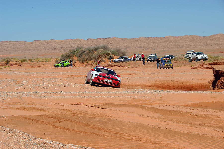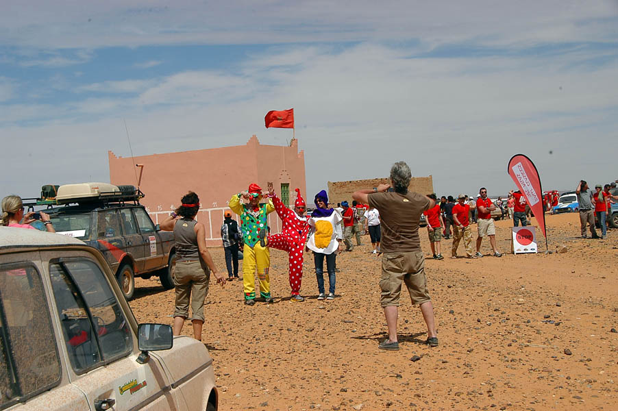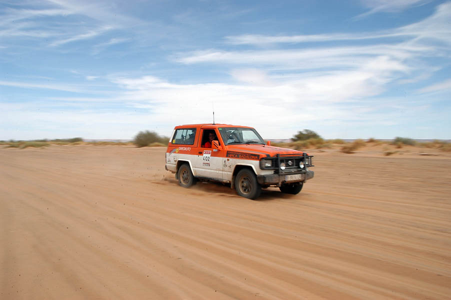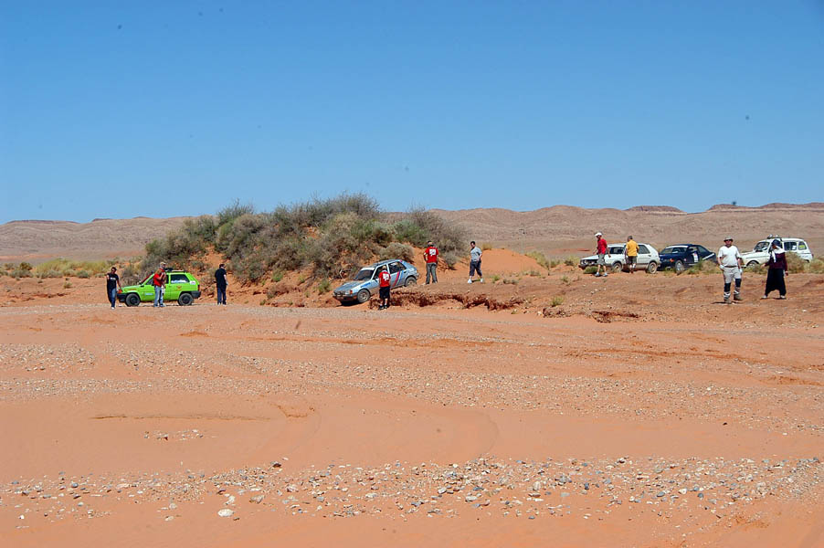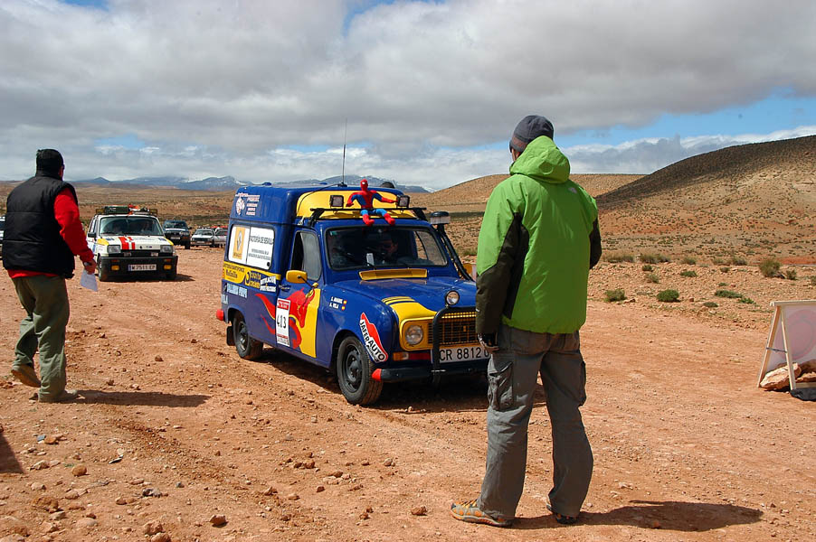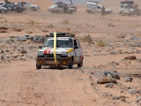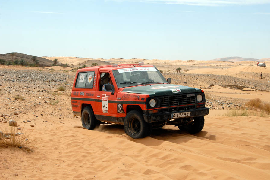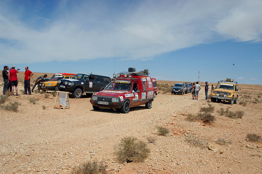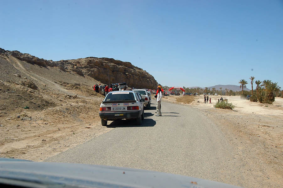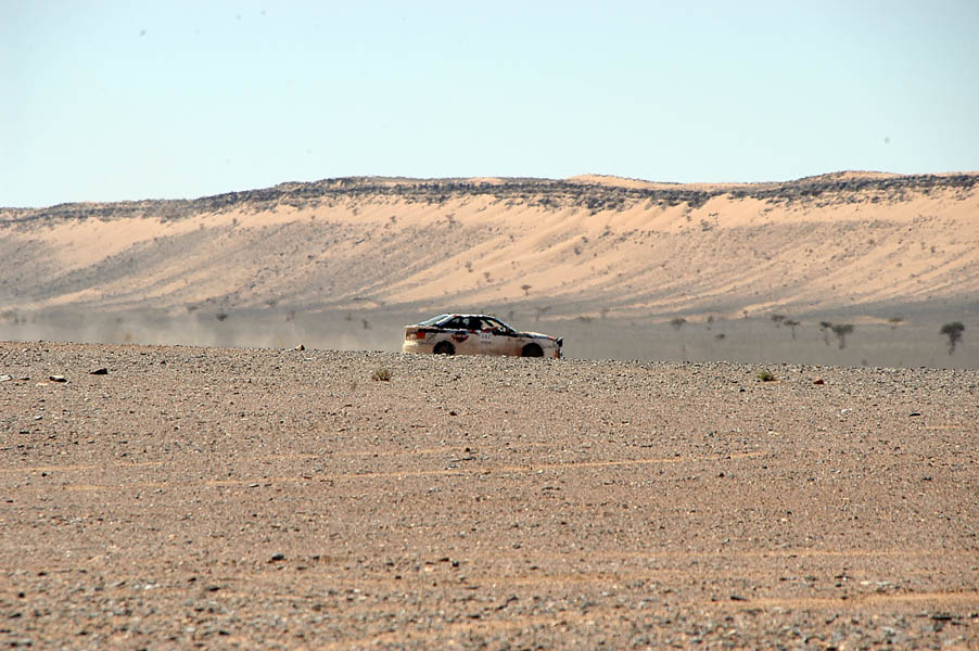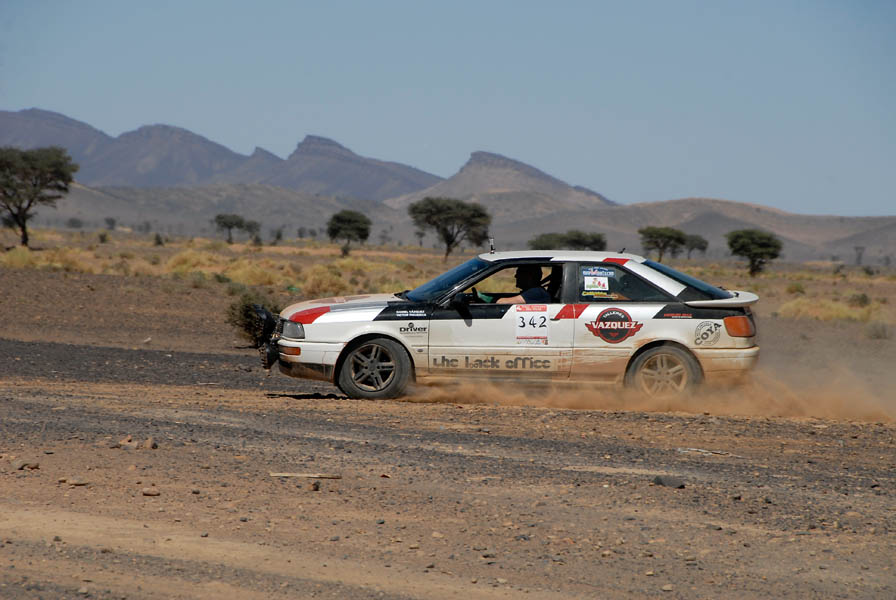 La quinta etapa incluía un tramo de orientación con brújula que se realizaría al suroeste de Rissani, tras salir del albergue se realizaría el enlace por carretera hasta llegar y atravesar esta bulliciosa ciudad, para tras los 46 Km. de enlace llegar al punto donde se daría la salida al tramo de regularidad. Casi 90 Km. de pistas de todo tipo después, el road book de los participantes dejaba de tener las clásicas informaciones para pasar a tener fotos de diferentes acacias, hacia las cuales habrían de dirigirse siguiendo los rumbos que indicaba el road book. A partir de estos momentos fue frecuente ver coches que avanzaban en muy diversas direcciones sin tener muy claro si la que habían elegido era la buena. Esto motivó que tras cumplirse el tiempo previsto de entrada de los participantes, todavía hubiese algunos que no habían encontrado el camino bueno hacia la meta, lo que motivo que los coches de organización tuviesen que ir a la “busca y captura” del participante perdido. Finalmente, encontrados los perdidos y rescatados los averiados, todos pudieron llegar hasta el camping Tifina, lugar de “residencia” para la caravana durante esa noche.