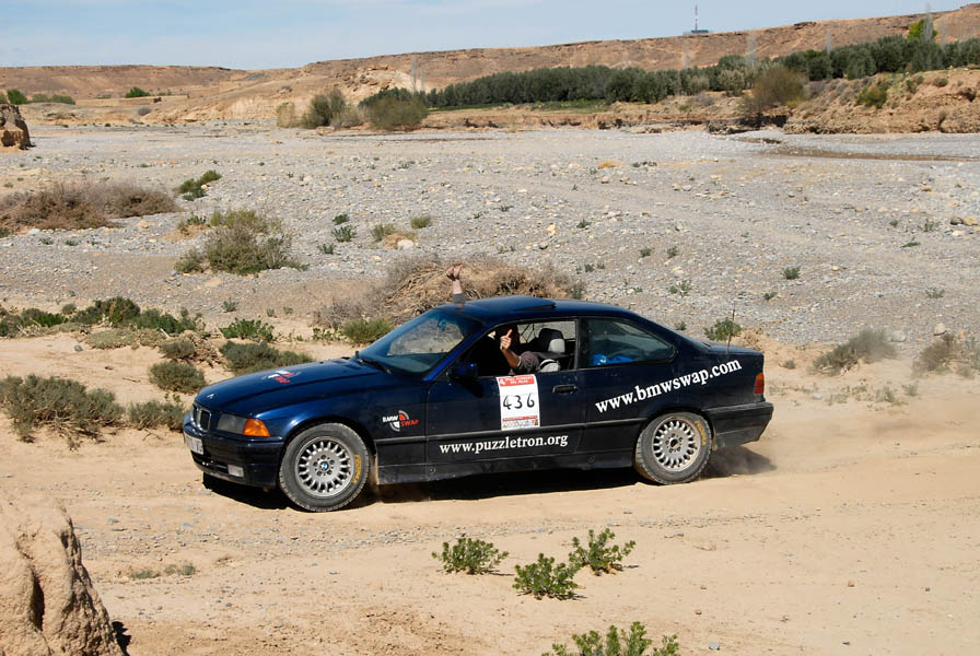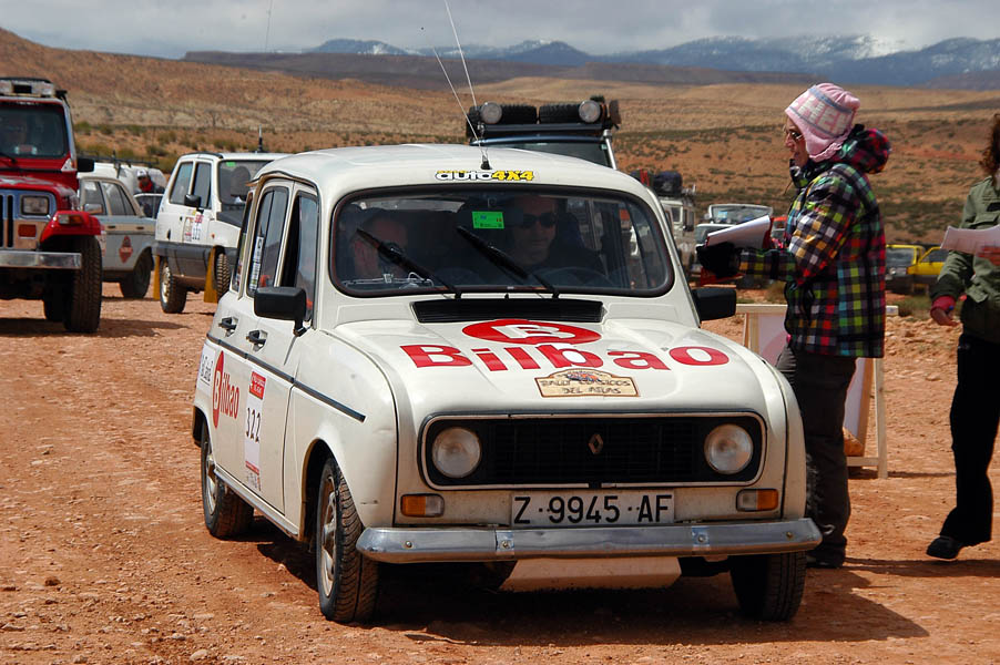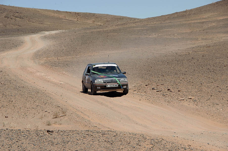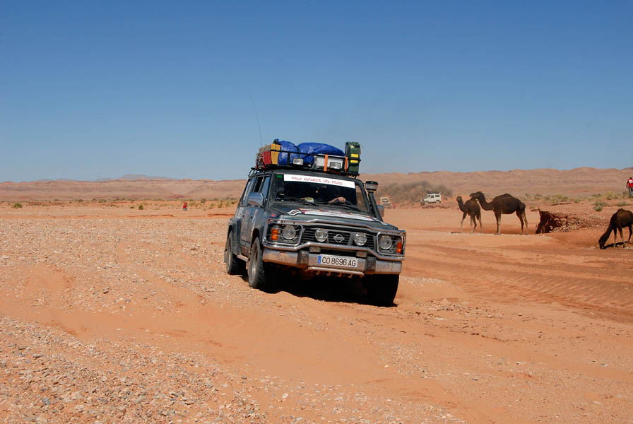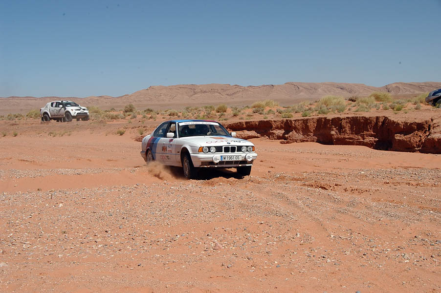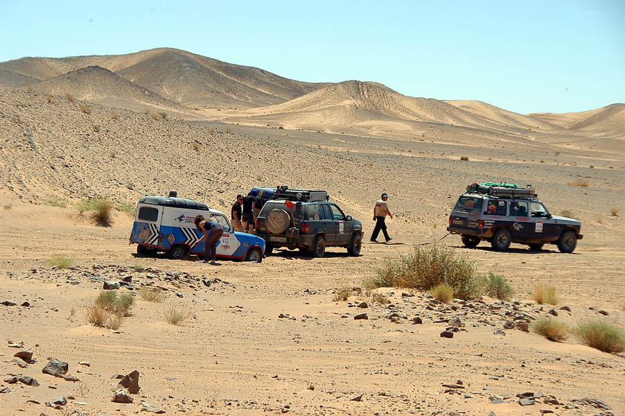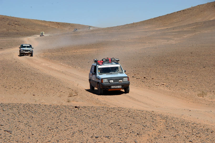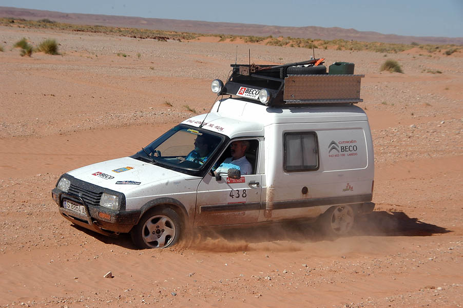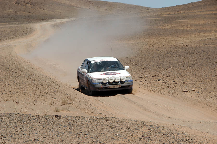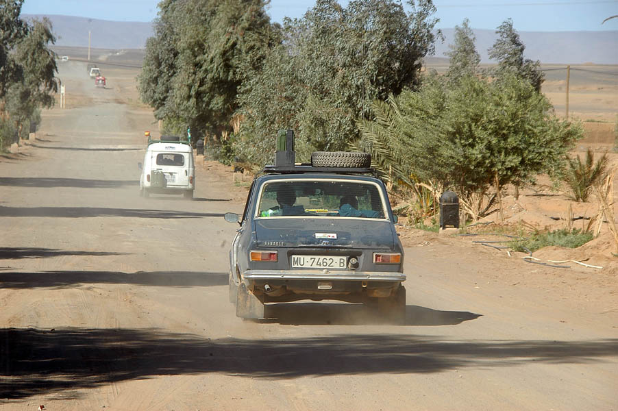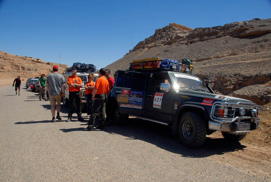 La quinta etapa incluía un tramo de orientación con brújula que se realizaría al suroeste de Rissani, tras salir del albergue se realizaría el enlace por carretera hasta llegar y atravesar esta bulliciosa ciudad, para tras los 46 Km. de enlace llegar al punto donde se daría la salida al tramo de regularidad. Casi 90 Km. de pistas de todo tipo después, el road book de los participantes dejaba de tener las clásicas informaciones para pasar a tener fotos de diferentes acacias, hacia las cuales habrían de dirigirse siguiendo los rumbos que indicaba el road book. A partir de estos momentos fue frecuente ver coches que avanzaban en muy diversas direcciones sin tener muy claro si la que habían elegido era la buena. Esto motivó que tras cumplirse el tiempo previsto de entrada de los participantes, todavía hubiese algunos que no habían encontrado el camino bueno hacia la meta, lo que motivo que los coches de organización tuviesen que ir a la “busca y captura” del participante perdido. Finalmente, encontrados los perdidos y rescatados los averiados, todos pudieron llegar hasta el camping Tifina, lugar de “residencia” para la caravana durante esa noche.