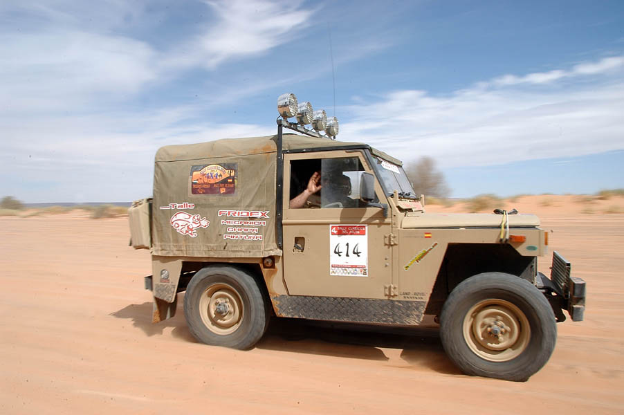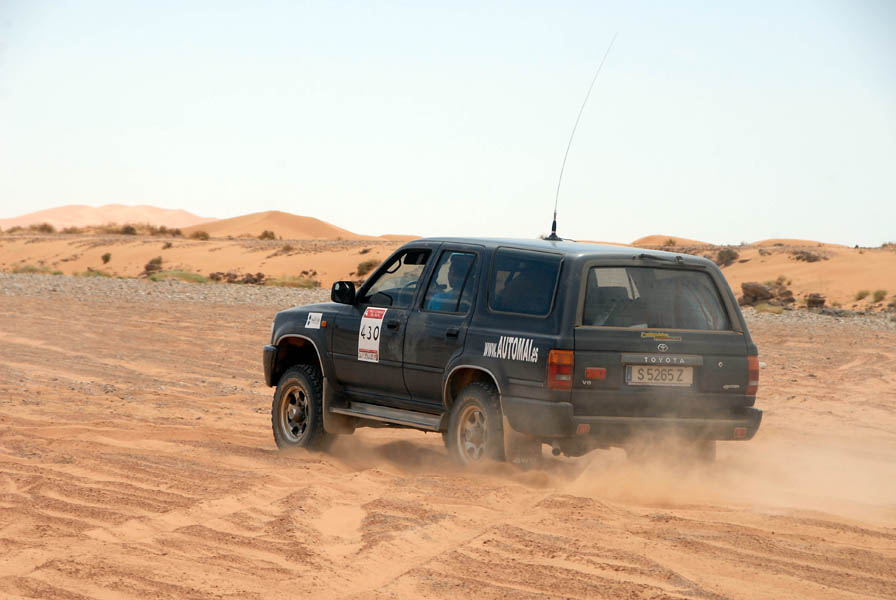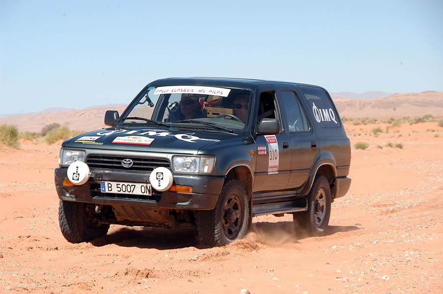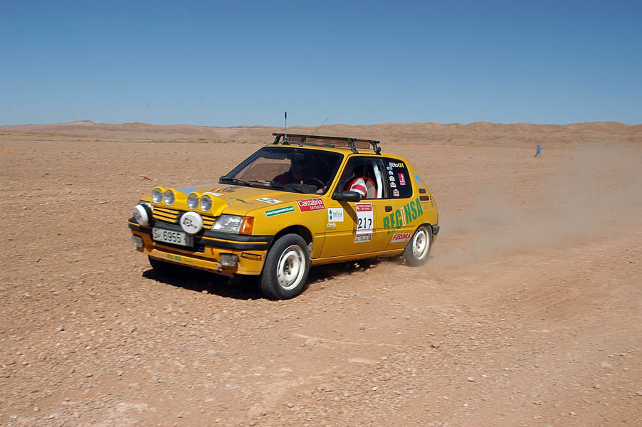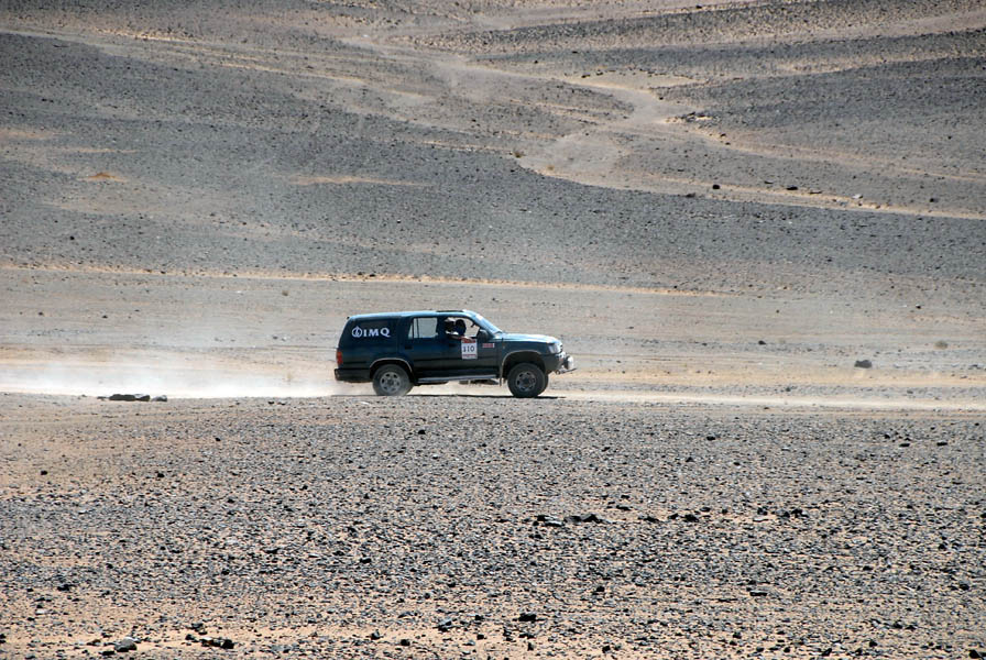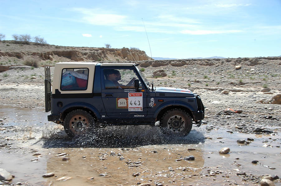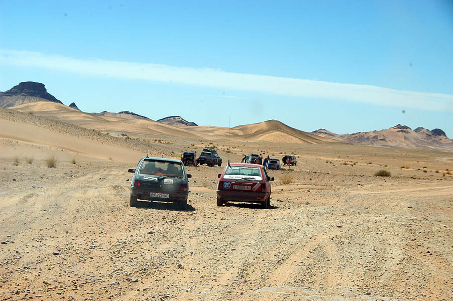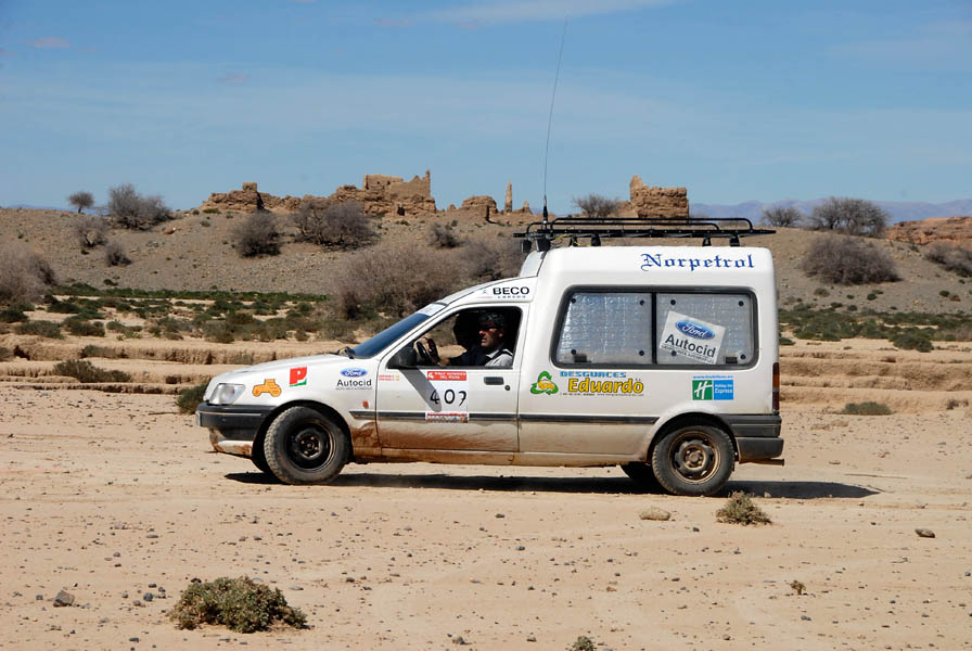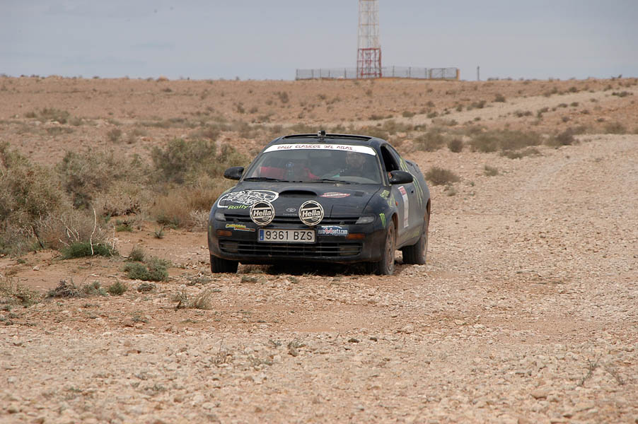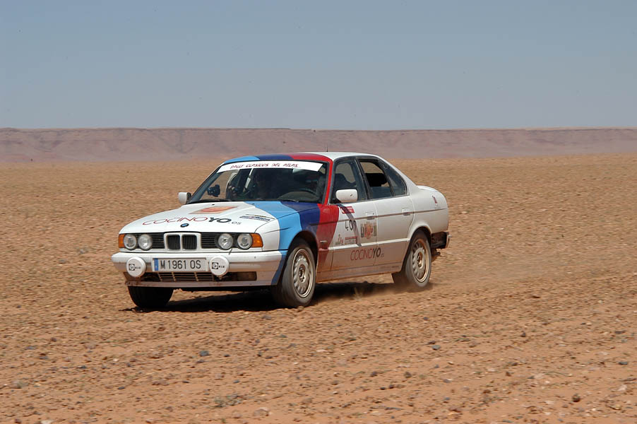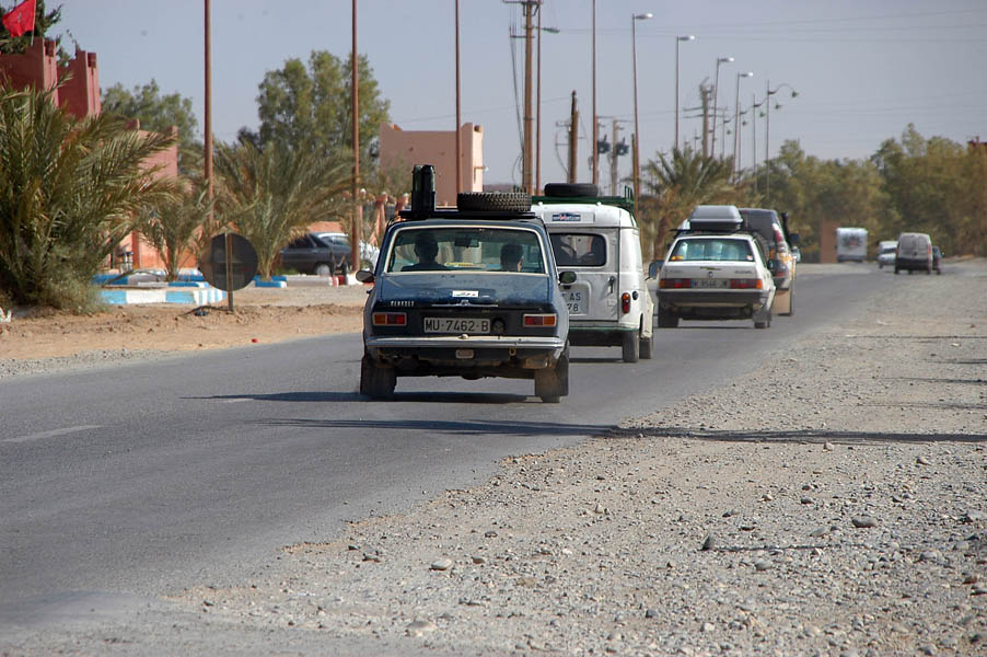 La quinta etapa incluía un tramo de orientación con brújula que se realizaría al suroeste de Rissani, tras salir del albergue se realizaría el enlace por carretera hasta llegar y atravesar esta bulliciosa ciudad, para tras los 46 Km. de enlace llegar al punto donde se daría la salida al tramo de regularidad. Casi 90 Km. de pistas de todo tipo después, el road book de los participantes dejaba de tener las clásicas informaciones para pasar a tener fotos de diferentes acacias, hacia las cuales habrían de dirigirse siguiendo los rumbos que indicaba el road book. A partir de estos momentos fue frecuente ver coches que avanzaban en muy diversas direcciones sin tener muy claro si la que habían elegido era la buena. Esto motivó que tras cumplirse el tiempo previsto de entrada de los participantes, todavía hubiese algunos que no habían encontrado el camino bueno hacia la meta, lo que motivo que los coches de organización tuviesen que ir a la “busca y captura” del participante perdido. Finalmente, encontrados los perdidos y rescatados los averiados, todos pudieron llegar hasta el camping Tifina, lugar de “residencia” para la caravana durante esa noche.