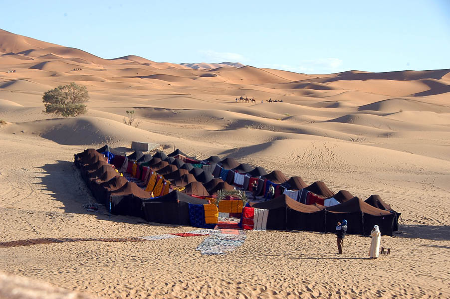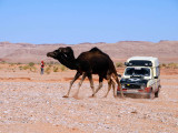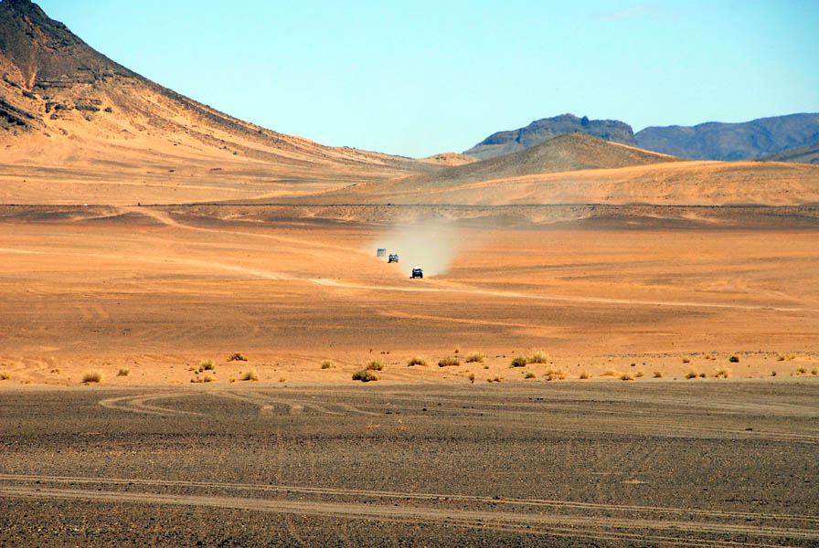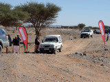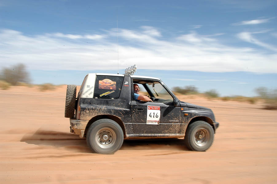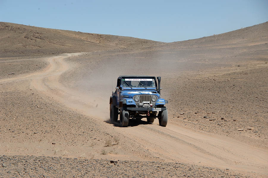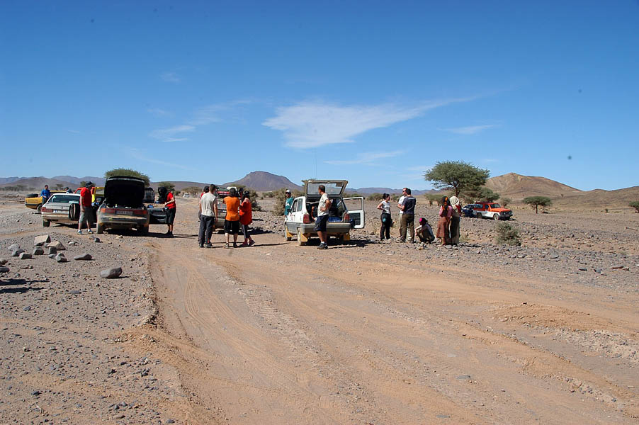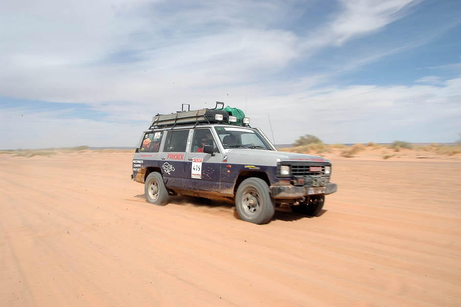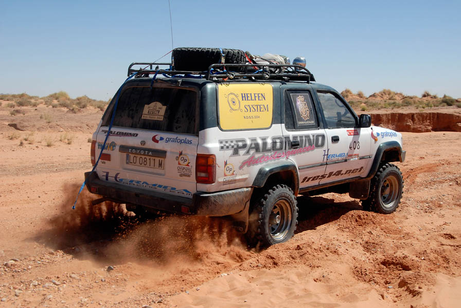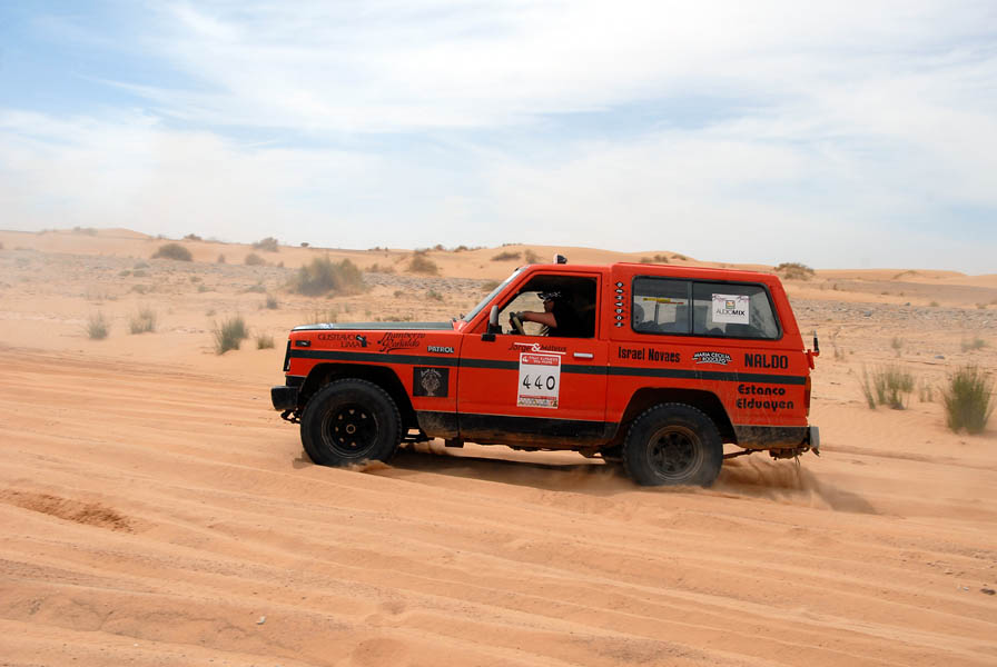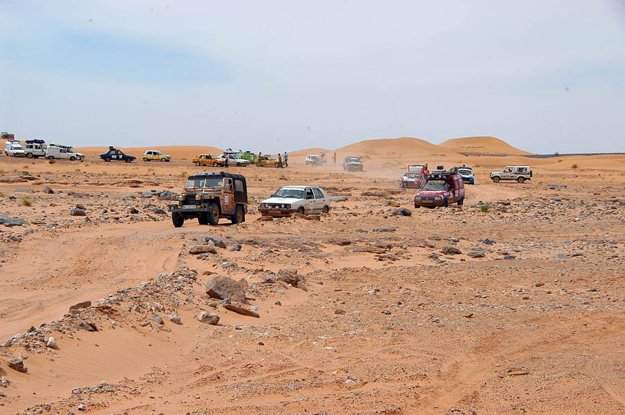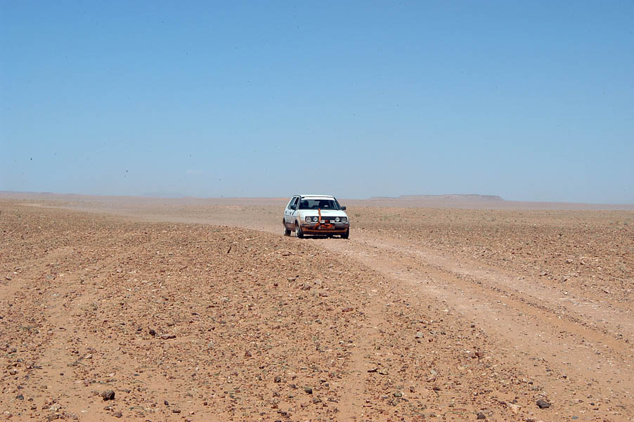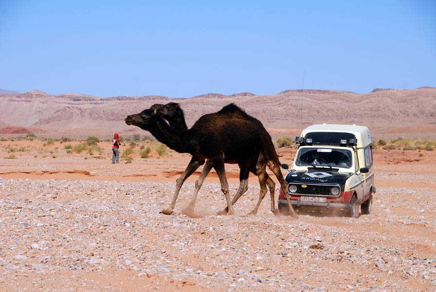 La quinta etapa incluía un tramo de orientación con brújula que se realizaría al suroeste de Rissani, tras salir del albergue se realizaría el enlace por carretera hasta llegar y atravesar esta bulliciosa ciudad, para tras los 46 Km. de enlace llegar al punto donde se daría la salida al tramo de regularidad. Casi 90 Km. de pistas de todo tipo después, el road book de los participantes dejaba de tener las clásicas informaciones para pasar a tener fotos de diferentes acacias, hacia las cuales habrían de dirigirse siguiendo los rumbos que indicaba el road book. A partir de estos momentos fue frecuente ver coches que avanzaban en muy diversas direcciones sin tener muy claro si la que habían elegido era la buena. Esto motivó que tras cumplirse el tiempo previsto de entrada de los participantes, todavía hubiese algunos que no habían encontrado el camino bueno hacia la meta, lo que motivo que los coches de organización tuviesen que ir a la “busca y captura” del participante perdido. Finalmente, encontrados los perdidos y rescatados los averiados, todos pudieron llegar hasta el camping Tifina, lugar de “residencia” para la caravana durante esa noche.