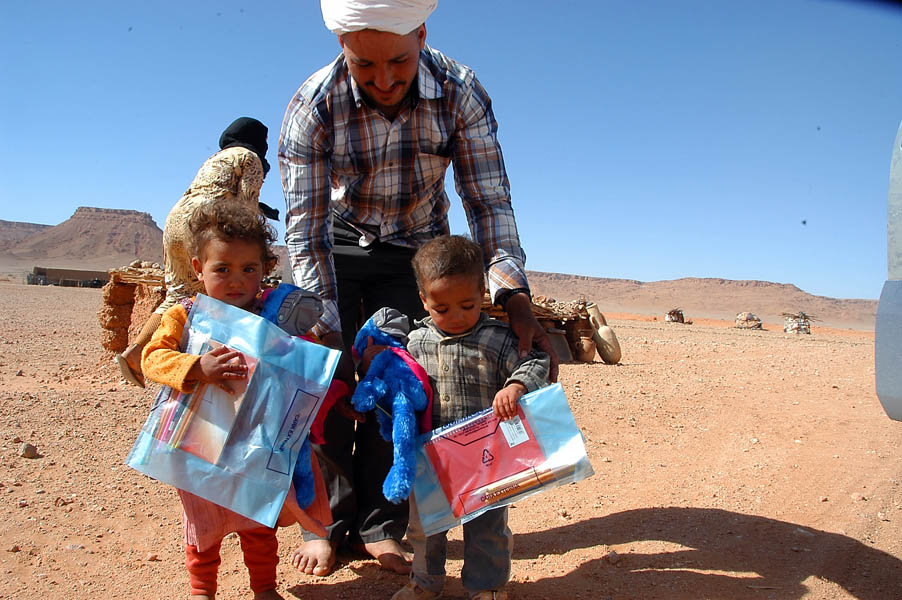 En primer lugar y tras salir del hotel en dirección a Erfoud, se continuaría por carretera primero, y pista después, hacia las inmediaciones del Erg Chebbi, para dirigirse a la primera escuela en la que se haría entrega del material, situada en Tisserdmine.