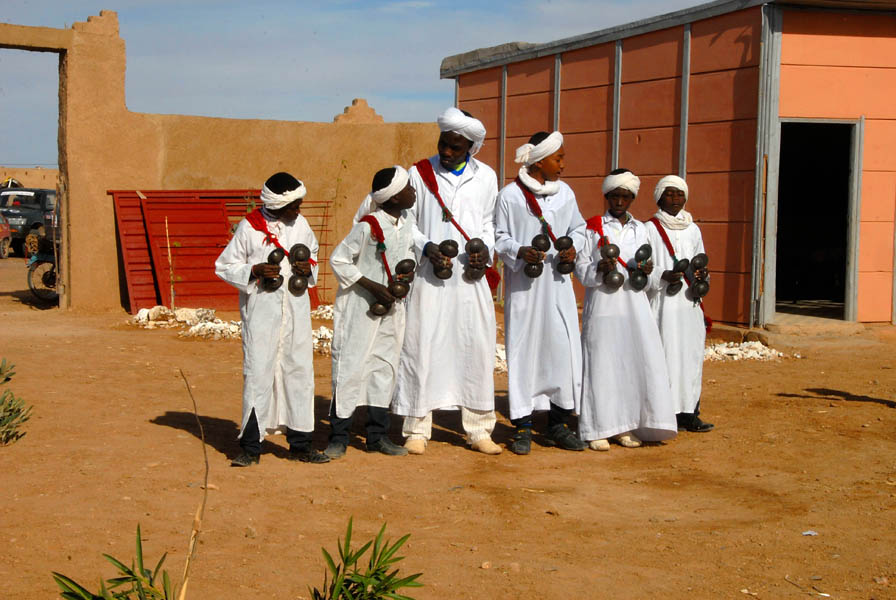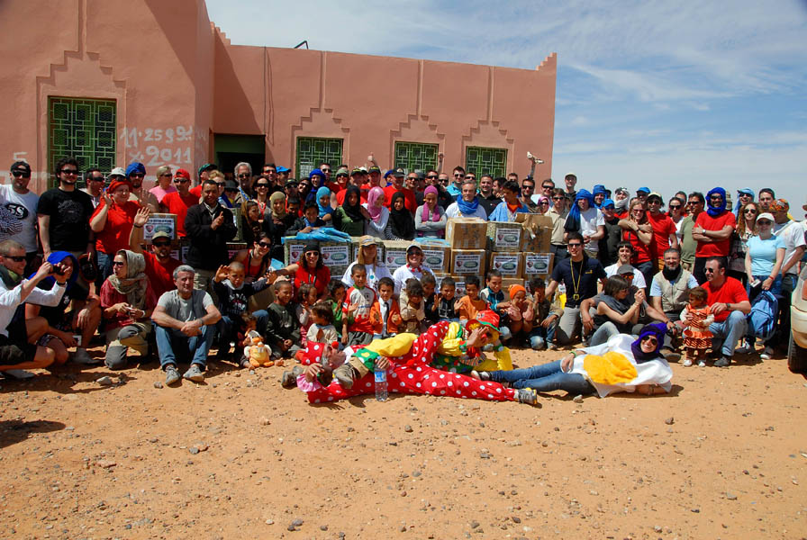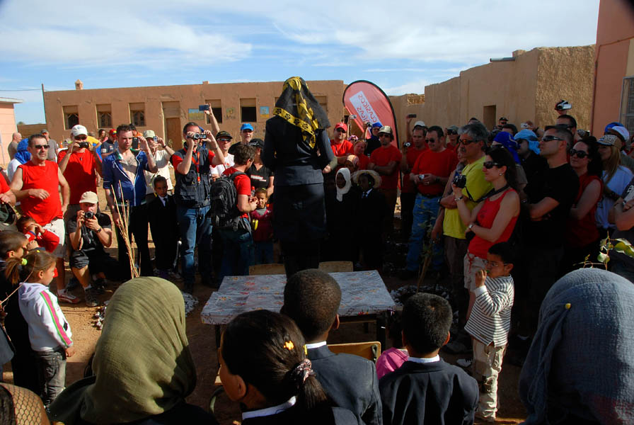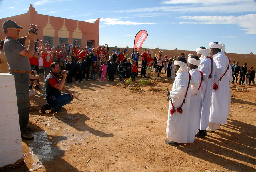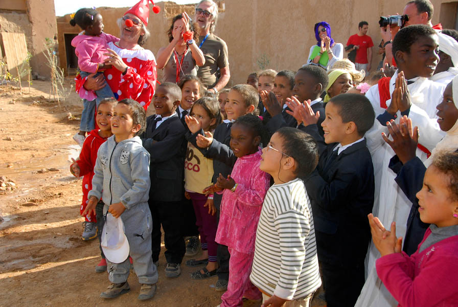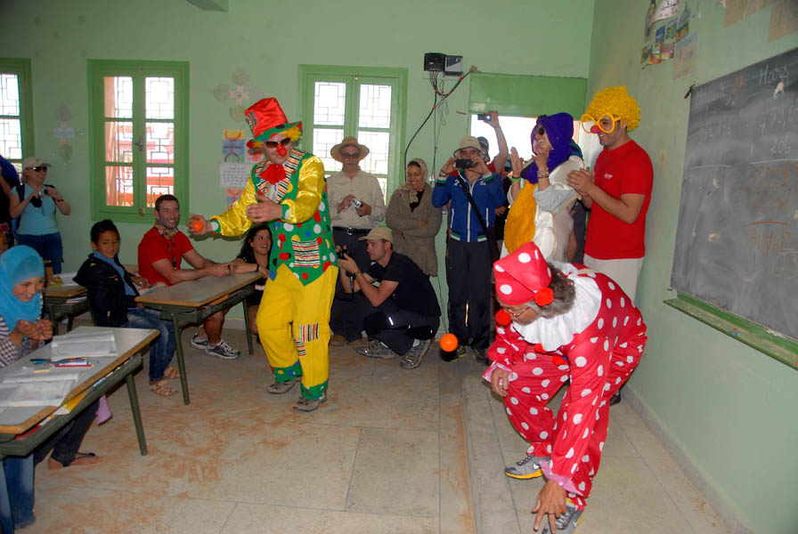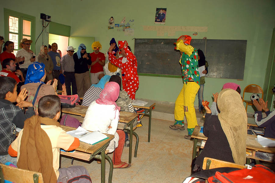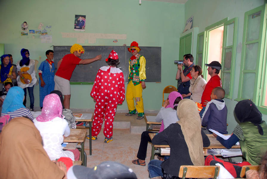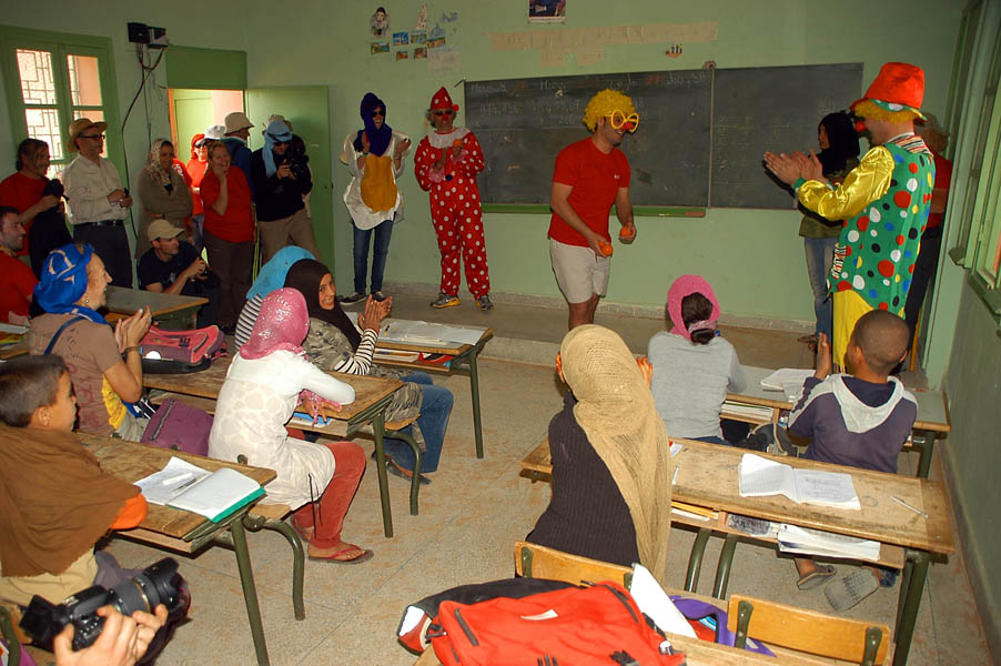 Finalmente y tras salir a la carretera de Taouz, giramos a la derecha para llegar a la nueva escuela y de nuevo poder disfrutar de la compañía de los niños y niñas durante un buen rato, en el que además de tomarnos un té, disfrutamos de la actuación de un grupo de jóvenes músicos locales y de un re-mix de “nuestros” payasos, que una vez más hicieron las delicias de los niños y los no tan niños.
