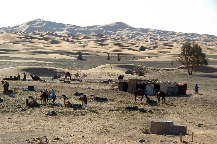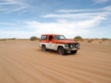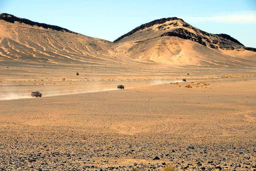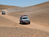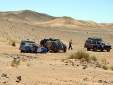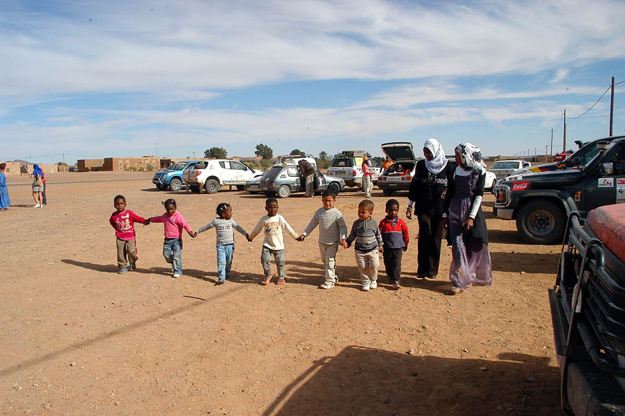 Tras la entrega en la escuela había que continuar, pues quedaba otra por hacer, en esta ocasión en la escuela de Khamlia, al sur del Erg Chebbi. Para llegar hasta ella los turismos se separaron de los 4×4, yendo estos últimos por el río de arena que bordea las dunas y los primeros por la pista que bordea el Erg Chebbi más exteriormente. Aunque la arena del río estaba blanda y cabía suponer que serían algunos 4×4 los que lo pasarían mal, la realidad es que fueron los turismos, al encontrarse con algunos pasos arenosos los que tuvieron que trabajarse el avanzar.