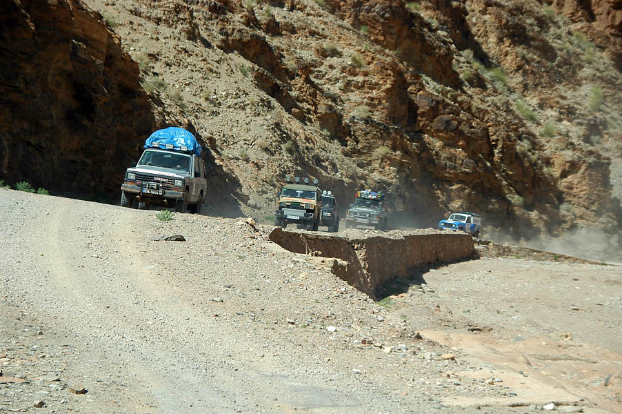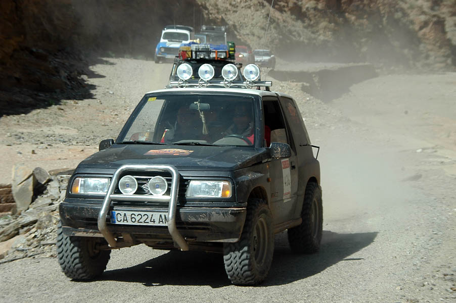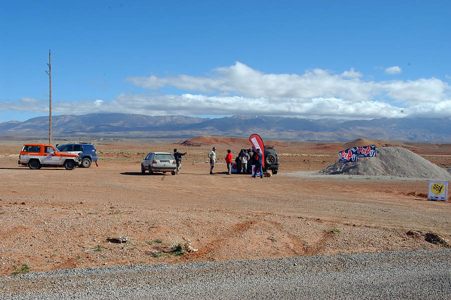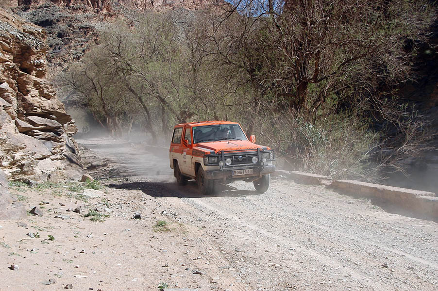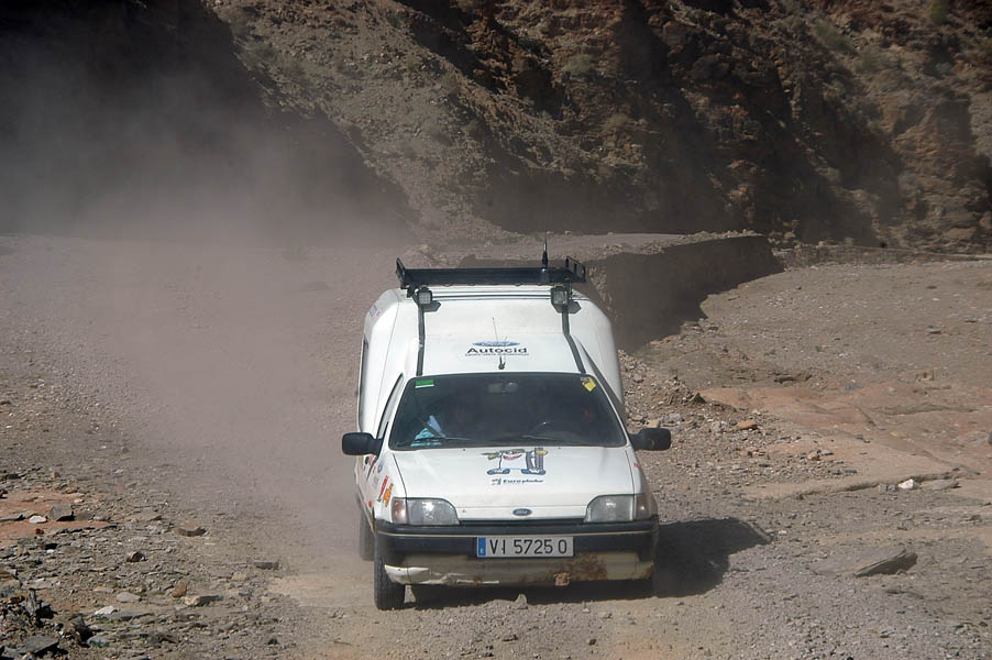 Este primer tramo de regularidad transcurrió por una antigua zona minera que cruzó diversas poblaciones e instalaciones mineras abandonadas, pasando por una espectacular garganta de la que se salía a través de un puente de madera cuyas tablas se movían al pasar el coche por encima. Carreteras rotas, tramos de pista en todo tipo de estado y algún vadeo compondrían este primer tramo de 64 Km. que terminaría en las inmediaciones de la ciudad de Midelt, donde algunos participantes hicieron las primeras visitas a los talleres locales antes de llegar al camping Ksar Timnay, donde toda la caravana pernoctaría.