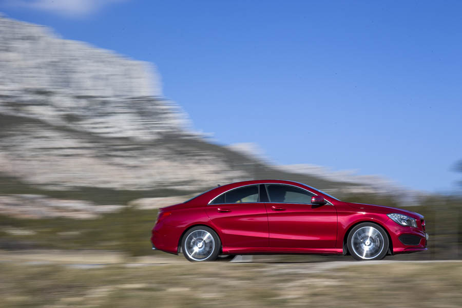 Los diseñadores han incluido numerosos detalles que hacen patente que el CLA es la evolución formal del CLS. Tres llamativas líneas estructuran la perspectiva lateral: la arista delantera por encima del guardabarros desciende hacia la zaga describiendo la característica «dropping line»; el hombro sobre el eje trasero se ve acentuado por una tersa arista y otra línea, que se extiende dinámicamente hacia los grupos ópticos traseros a partir de la rueda delantera.