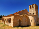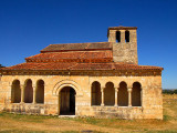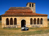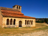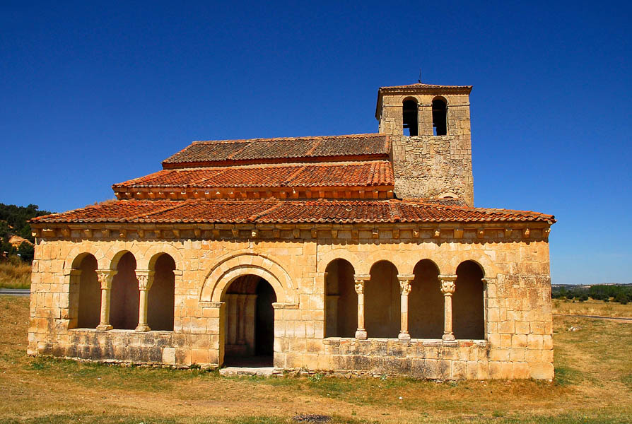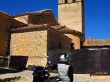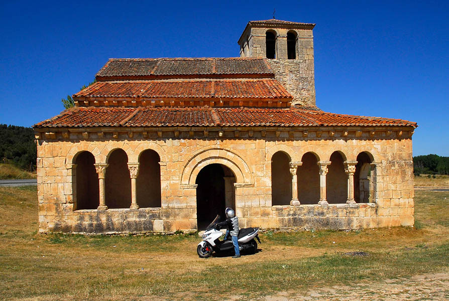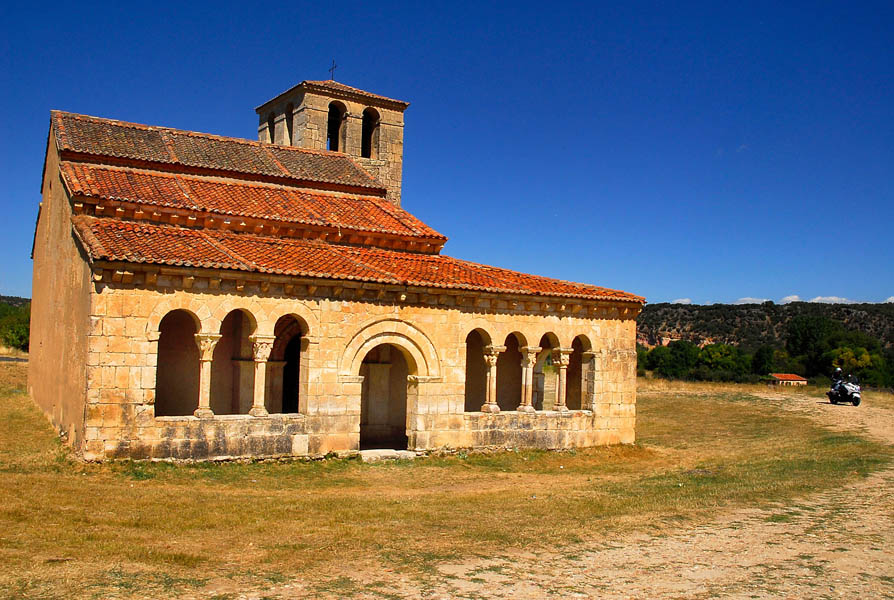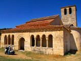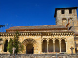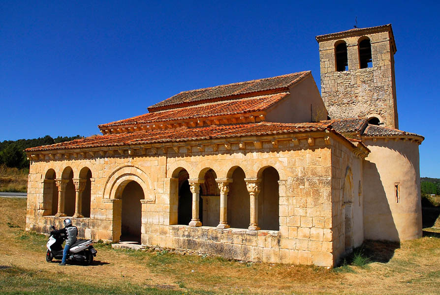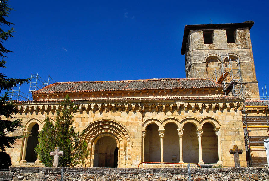 Se dice que está ubicada sobre un viejo templo romano. Actualmente tiene tres naves rematadas interiormente por tres ábsides, torre en el lado norte, una buena portada de arquivoltas de medio punto y una galería porticada con grandes capiteles de cabezas humanas entre volutas, aves picándose sus patas, sagitarios, arpías, etc. Las fotos de rigor durante una breve pausa aportan aún más relajación y tranquilidad a esta placida y soleada mañana.