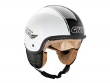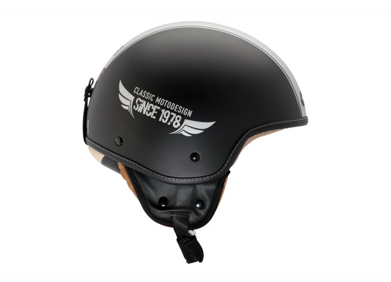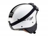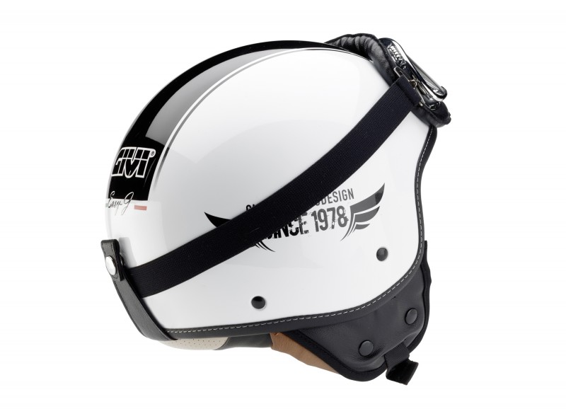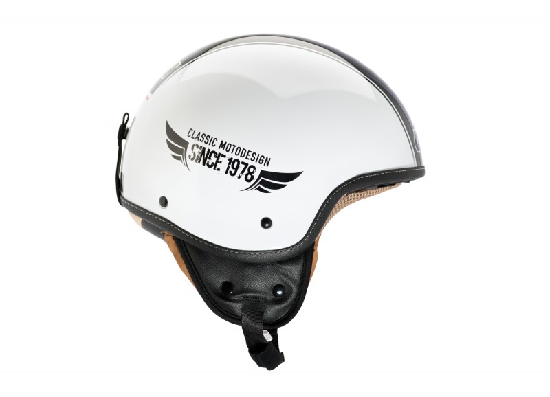 Las características principales de este casco son la ausencia de visera, la incorporación de una correa posterior para sujetar las gafas (de moto con tira elástica), rebordes de piel que refuerzan su carácter retro y una gran ligereza (900 gr. de peso). En cuanto al color de la calota, existen dos versiones del casco: blanco brillante y negro mate, ambas contrastantes con el interior del casco, en color camel.