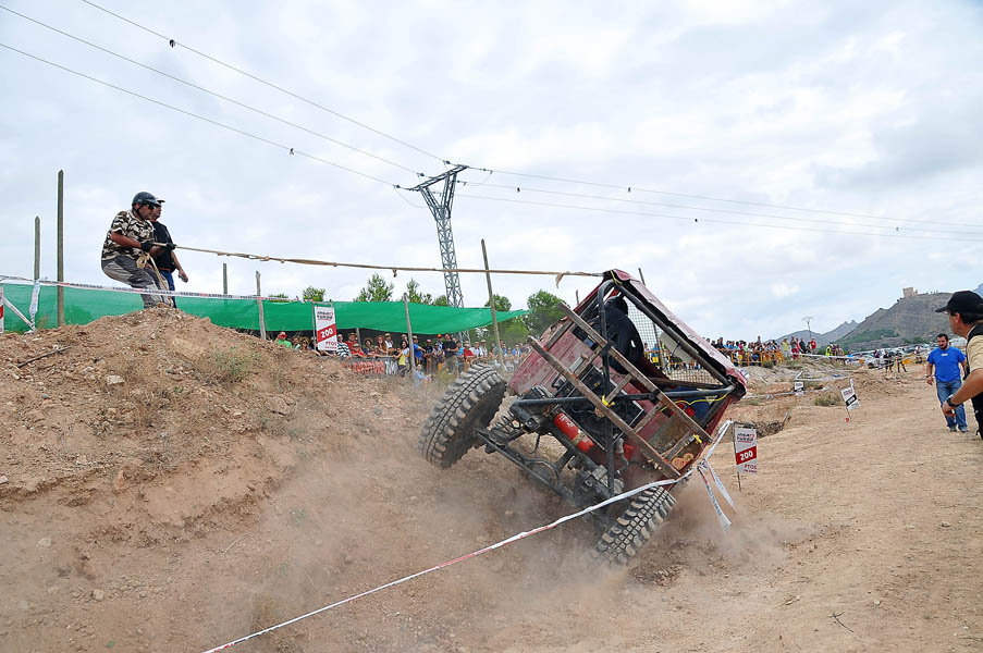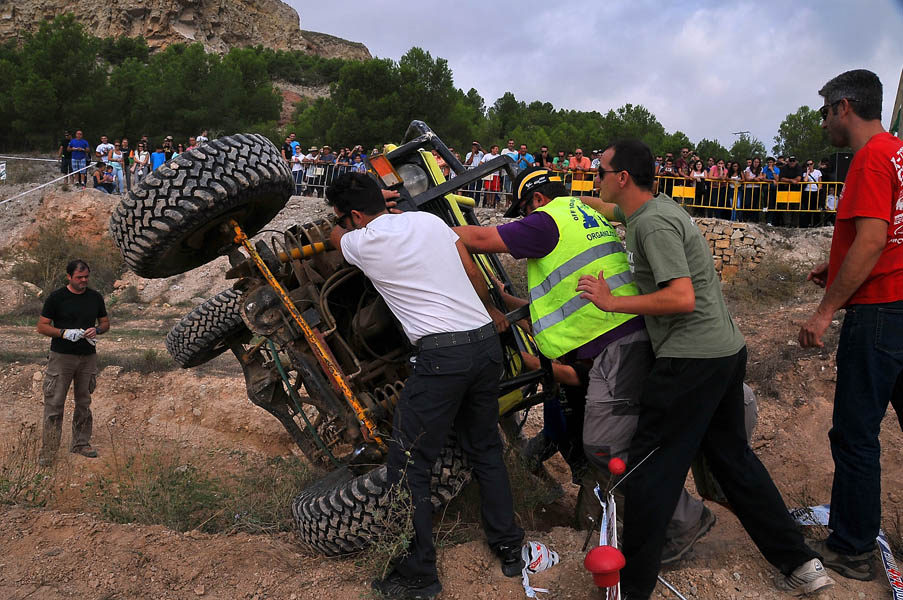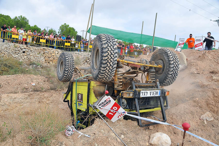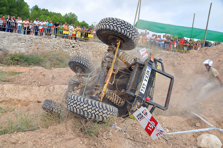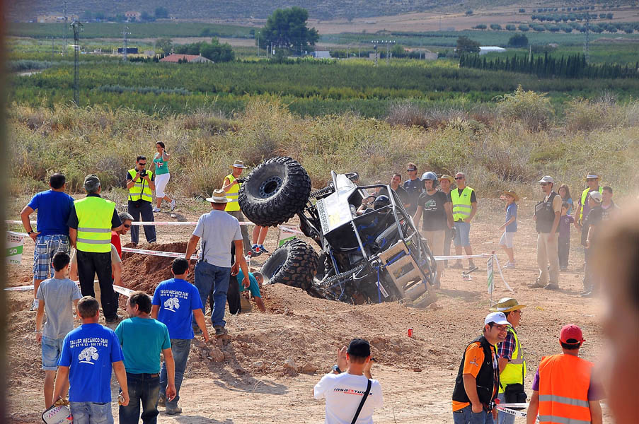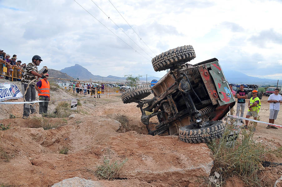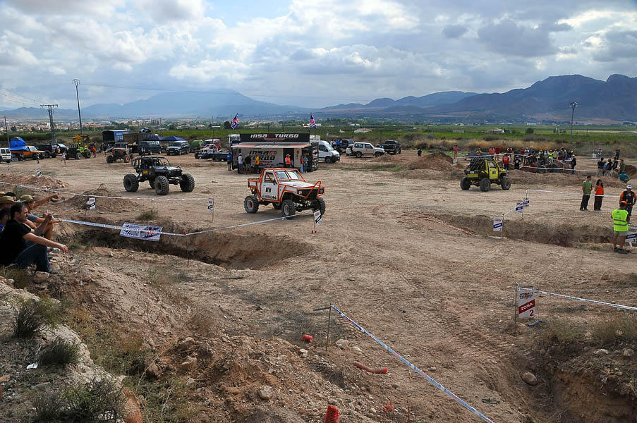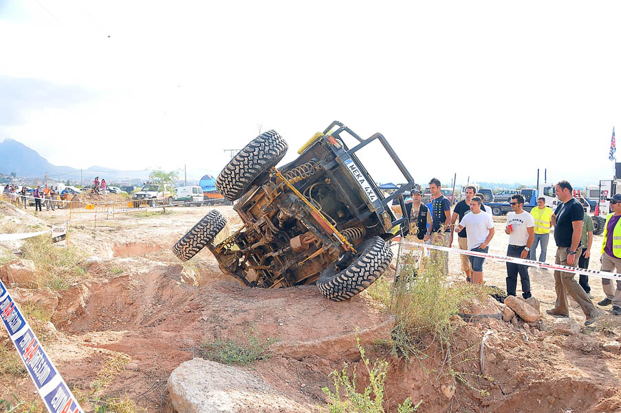 Tanta emoción merecía una organización de lujo, y esta fue la que nos ofreció el Club Ocio y Aventura Jumilla, un club formado hace ya 12 años y que cuenta con 30 socios amantes de todo lo que tenga que ver con la conducción off road, que preparó un circuito técnico, variado y situado de tal manera que el público, colocado en una especie de anfiteatro elevado, podía ver la totalidad de las zonas, lo que motivó que todo aquel que venía, no se fuese en toda la mañana, enganchado por el espectáculo que los continuos vuelcos y posiciones extremas que llegaban a alcanzar los coches, les ofrecía.