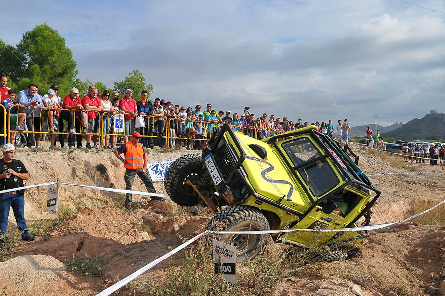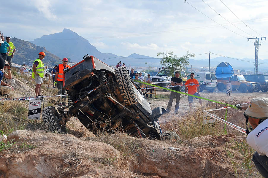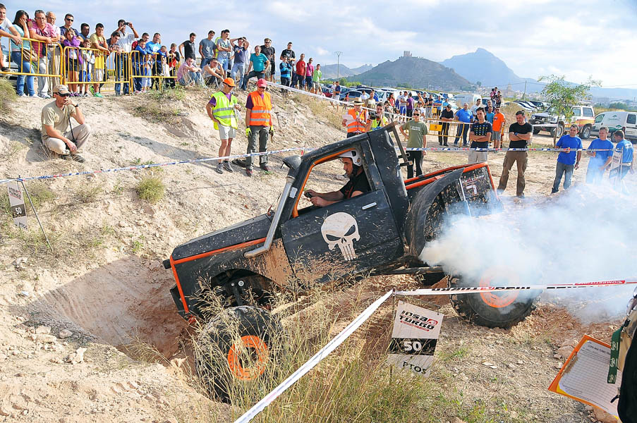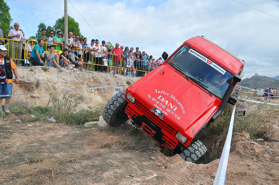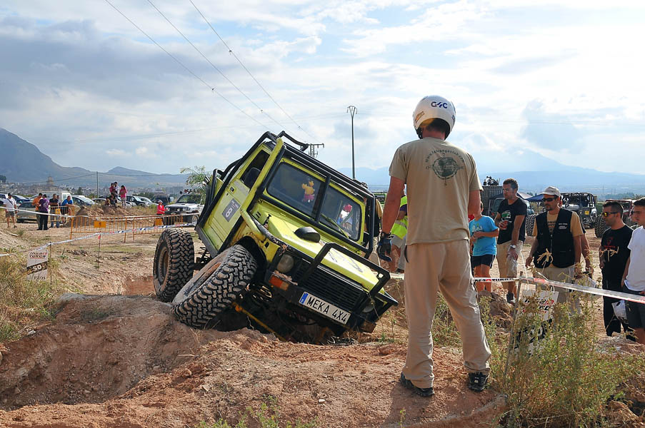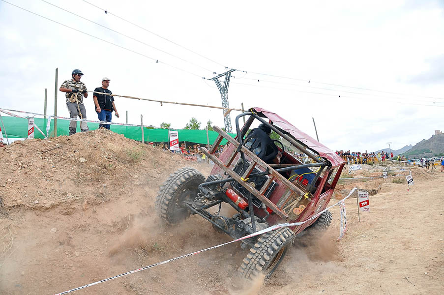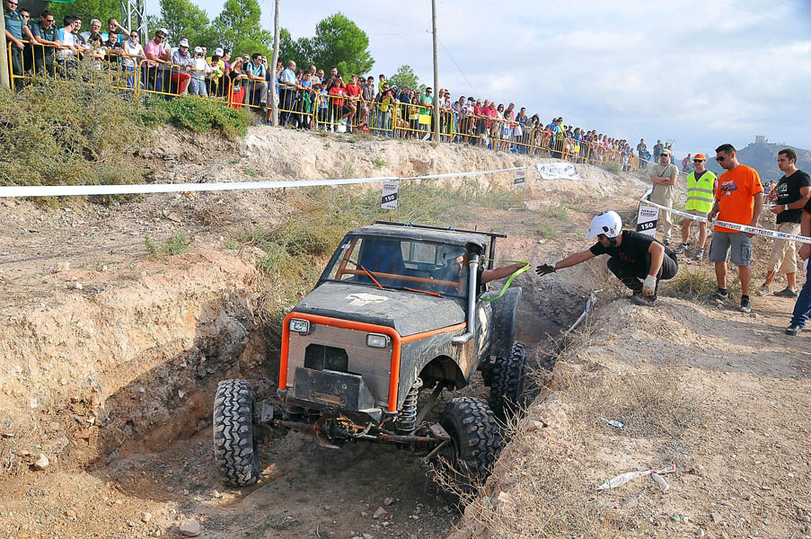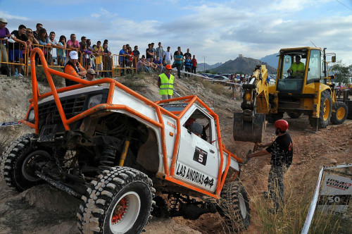 Tanta emoción merecía una organización de lujo, y esta fue la que nos ofreció el Club Ocio y Aventura Jumilla, un club formado hace ya 12 años y que cuenta con 30 socios amantes de todo lo que tenga que ver con la conducción off road, que preparó un circuito técnico, variado y situado de tal manera que el público, colocado en una especie de anfiteatro elevado, podía ver la totalidad de las zonas, lo que motivó que todo aquel que venía, no se fuese en toda la mañana, enganchado por el espectáculo que los continuos vuelcos y posiciones extremas que llegaban a alcanzar los coches, les ofrecía.