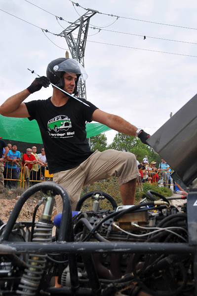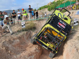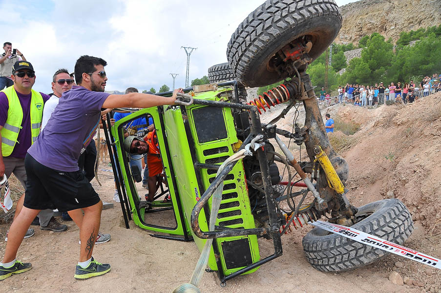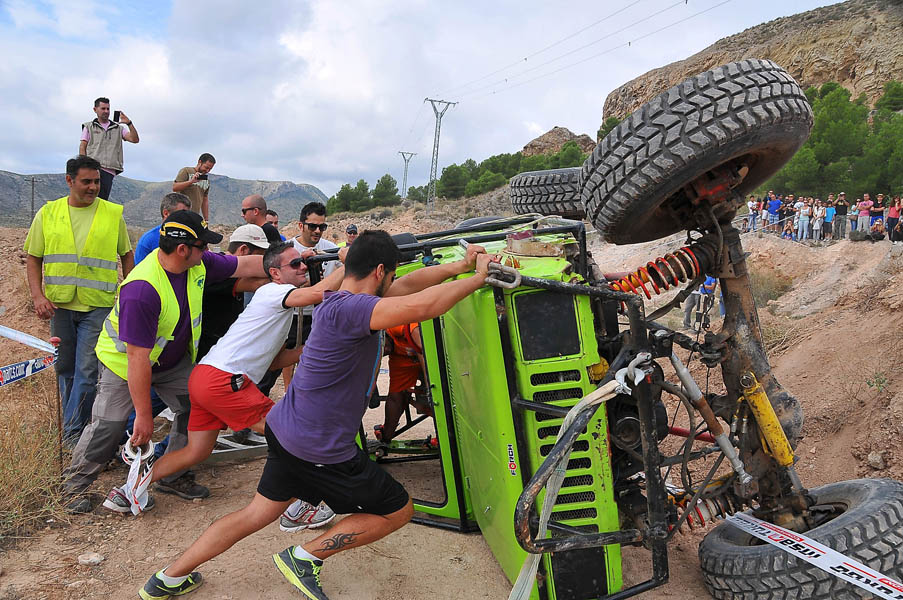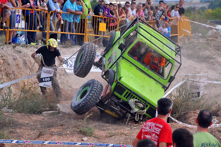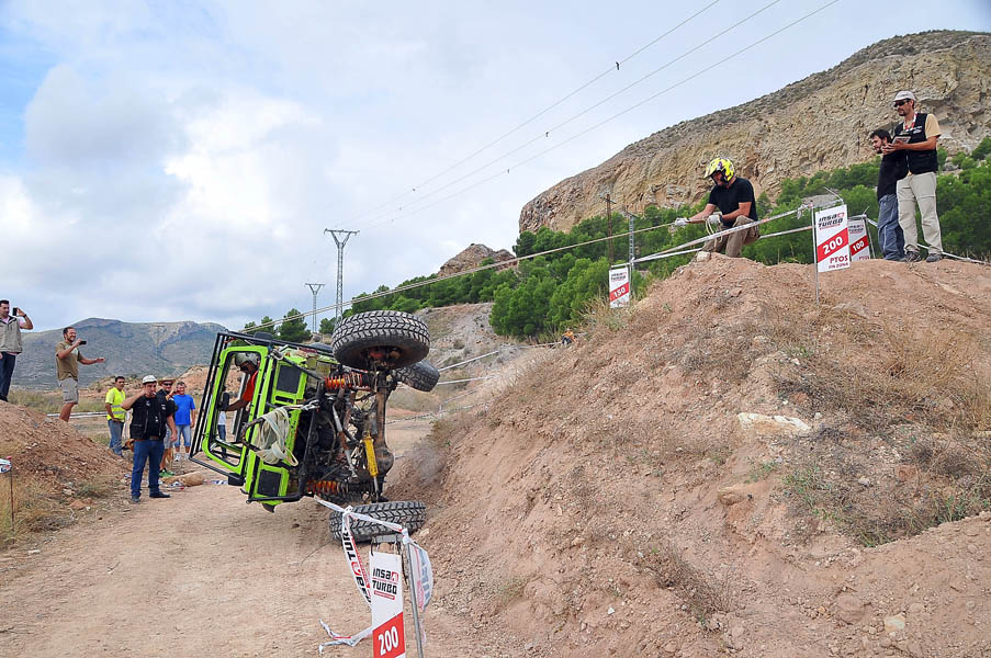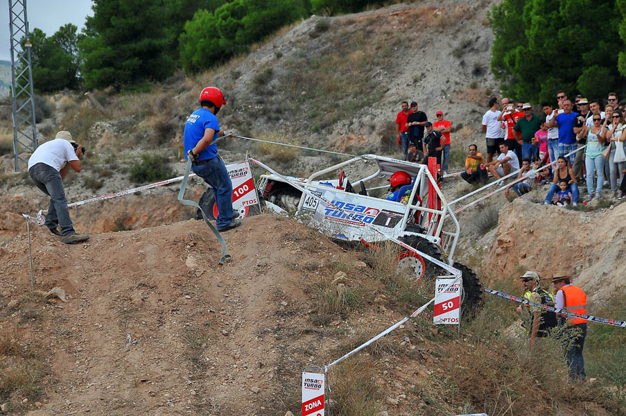 Mientras, “Mani” y Chillerón, tampoco faltos de problemas, tras la rotura del motor de arranque deciden mantener toda la mañana el coche en marcha, bajo de ralentí entre zonas y subiéndolo antes de cada zona para evitar una posible calada de motor que podría ser fatal. Con un “Juan… hasta el rabo todo es toro”, recordando la frase que Cuenca le dijo a Chillerón en la ya citada prueba final de L´Alcudia 2011, donde teniendo cruzada delante la última estaca de la última zona con el coche prácticamente volcado y desllantado, Chillerón saltó por encima del capó, cogió la eslinga con todas sus fuerzas y grito TIRAAA… sacando el coche de lo imposible, para ganar el trial por 15 puntos, ante una estaca que les hubiera costado 25 de penalización, “Mani” y Juan afrontaban sus últimas zonas sabiendo que hasta el último momento, todo era posible.