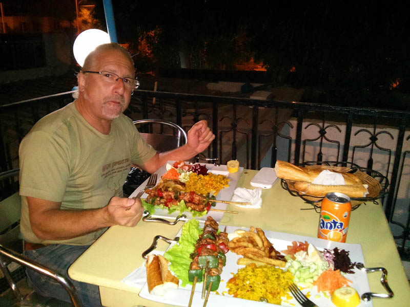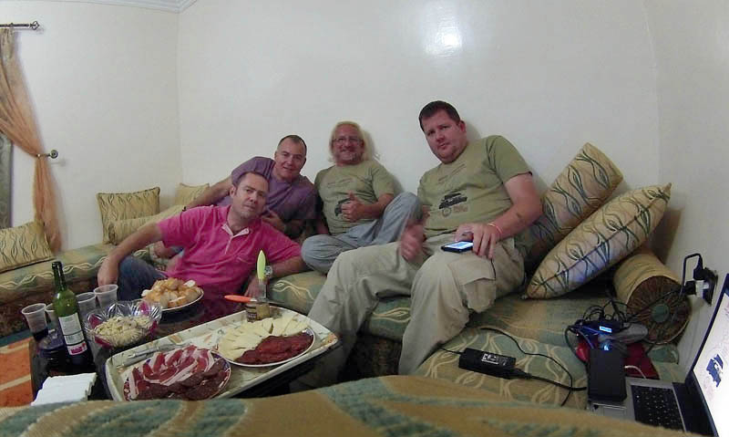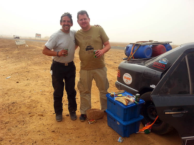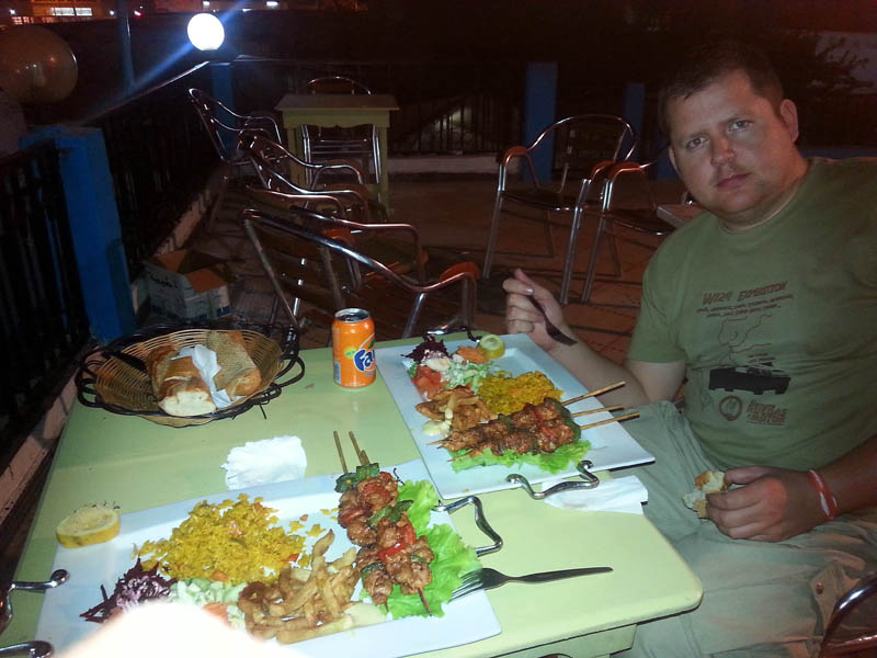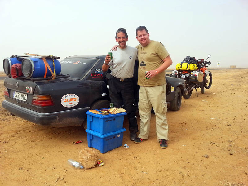 Llamamos por teléfono a Alfredo, un antiguo participante del Sahara Aventura que por trabajo pasa largas temporadas en Mauritania y que al enterarse de nuestro viaje se ofreció a hacernos de anfitrión. Nos vino a buscar, nos llevó a su casa, guardamos el coche en su garaje, y nos llevó a cenar al restaurante de Toni, el FC Noadhibou. Toni es “el contacto” a tener en Noadhibou, no solo por lo bien que se come en su restaurante… sino porque conoce a todo el mundo. Le preguntamos por un mecánico para que echase una ojeada al ruido que desde Tan Tan hacía el coche y aunque ya era tarde, le llama por teléfono y este viene al restaurante donde quedamos con él para llevarle el coche al día siguiente.