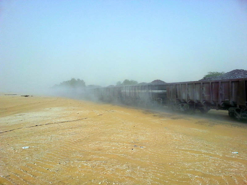 Tras preguntar a unos “paisanos” que nos indican donde es, nos encontramos llegando a un punto en el que íbamos a cruzar la vía, algo que no debíamos hacer pues la vía del tren siempre transcurre a la izquierda de esta, y justo en ese momento un profundo arenal nos deja medio empanzados, nada grave y motivado por ir con las presiones demasiado altas. Nos ponemos a bajar presiones y en ese momento llega el tren, por lo que me acerco a la vía para hacerle fotos y ver la nube de fina arena que va levantando a su paso.