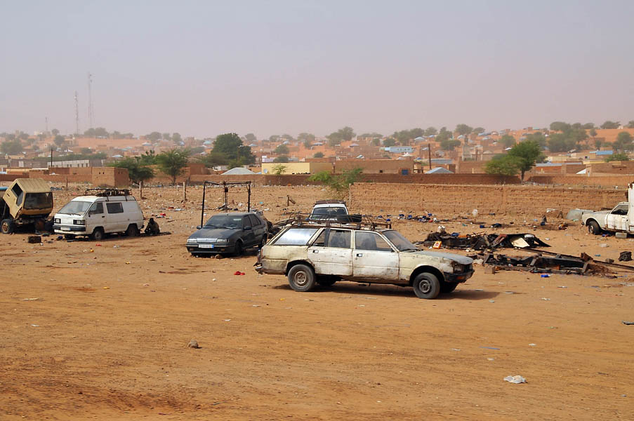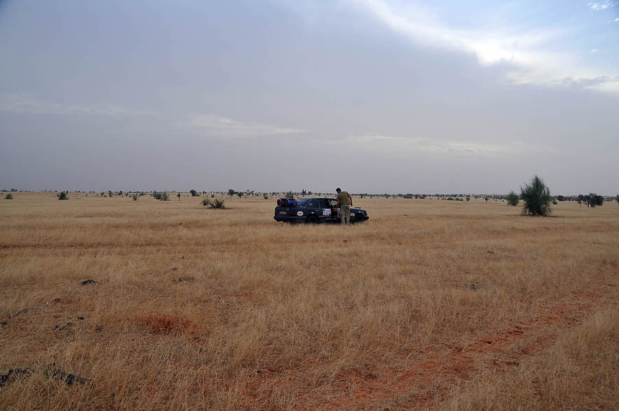 Finalmente, llegamos a un recinto vallado en cuyo exterior parece haber algún tipo de cartel oficial, lo que me tranquiliza. Dentro, hay un cobertizo de chapa del que sale un hombre uniformado, lo cual me tranquiliza más… finalmente nos piden la documentación, les damos la ficha, nos preguntan el tan manido “de donde venimos y a donde vamos” y tras un rato y unas llamadas de teléfono, nos vuelven a acompañar al control de la policía que habíamos pasado anteriormente, disculpándose y explicándonos que era por nuestra seguridad y volviéndonos a indicar claramente que cuidado con perder la pista principal que nos metíamos en Mali.