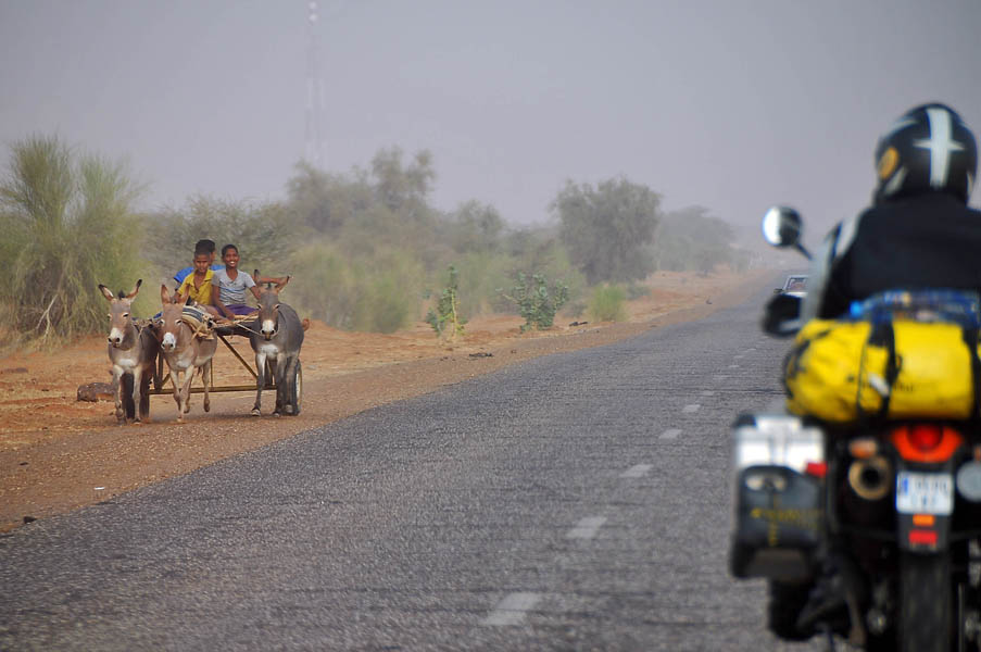Continuamos y alcanzamos a una pick up con la caja cargada de personal, nos ponemos a su lado, le hacemos parar y le preguntamos si vamos bien para Selibaby. Estamos en los alrededores de Kankessa, muy cerca de Mali, y las posibilidades de despistarte y meterte allí son muy altas. Después de una interesante charla con el conductor de la pick up, nos dice que le sigamos y nosotros le seguimos, aunque no sabemos muy bien porqué, ya que al final no nos habíamos enterado ni para donde iba él ni en que dirección íbamos nosotros.