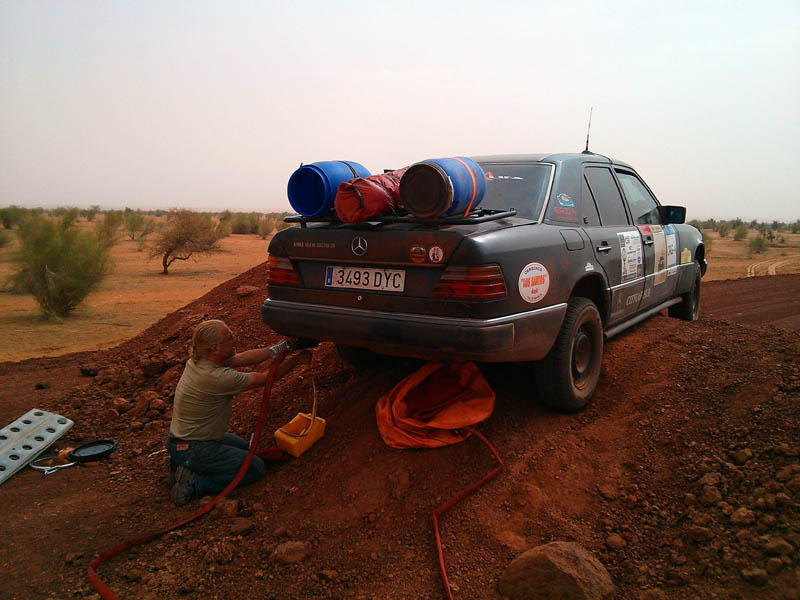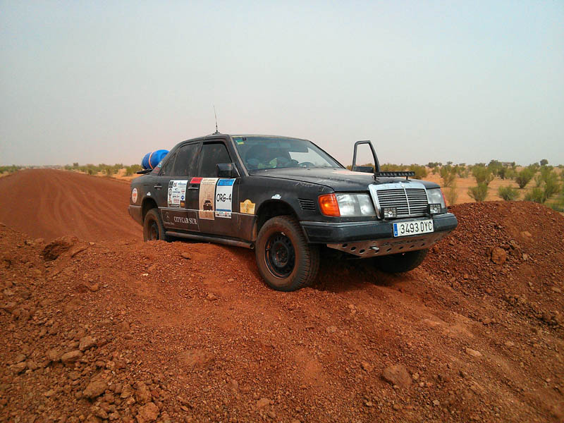 Íbamos arrastrando los bajos continuamente, golpeando con piedras de todos los tamaños y acordándonos de “San Bumar Xtreme”, sin el que sin lugar a ninguna duda, el viaje habría terminado hacía varios días. Nos habíamos convertido en todo un espectáculo para los ocupantes de la caja de la pick up que debían ir haciendo una porra para acertar cuando nos íbamos a quedar enganchados. Sin embargo, una detrás de otra, el Mercedes salía de los atolladeros consiguiendo que los ocupantes de la pick up nos aplaudieran, nos pusiesen continuamente el pulgar en alto y se fuesen echando una buenas carcajadas.