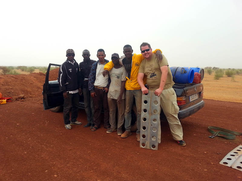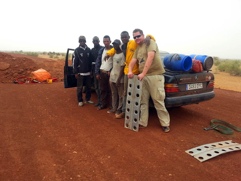 En lo que estamos “entretenidos” con nuestras planchas, la pala, el Air Jack… aparece una pick up con cinco paisanos que en cuanto nos ven paran a echarnos una mano, tras otro par de intentos de empujar y tirar de pala, planchas y piedras, decidimos que la pick up nos pegue un tirón y después de varios intentos, bajamos el Mercedes a la pista, momento de hacerse la foto de rigor de todo “el equipo”.