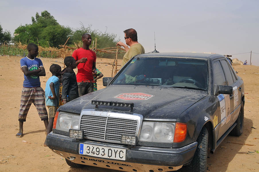 Esteban no reposta en Aleg y las siguientes gasolineras que encontramos no tienen gasolina, protegido por la seguridad que le aporta la compañía de nuestro coche, seguimos camino a ver si encontramos, pero finalmente, y después de muchas gasolineras sin gasolina, ya de noche cerrada, se queda tirado. Enganchamos una eslinga a la baca del capó del Mercedes y le remolcamos unos 50 Km. hasta llegar a un pueblo en que veo que tienen bidones en el suelo. Preguntamos si tienen gasolina y finalmente se acerca un paisano y nos dice que el tiene; Esteban se va con él y mientras nosotros esperamos, me doy cuenta de que el capó está un poco descuadrado… lo abro para ver y… ya no pudimos cerrarlo, al tirar de la moto se había modificado el ángulo de los brazos del capó trasero y se quedaba dos dedos más alto y tres dedos más atrás… lo sujetamos con una crica y tras venir Esteban seguimos camino…. Ya lo miraríamos al día siguiente.