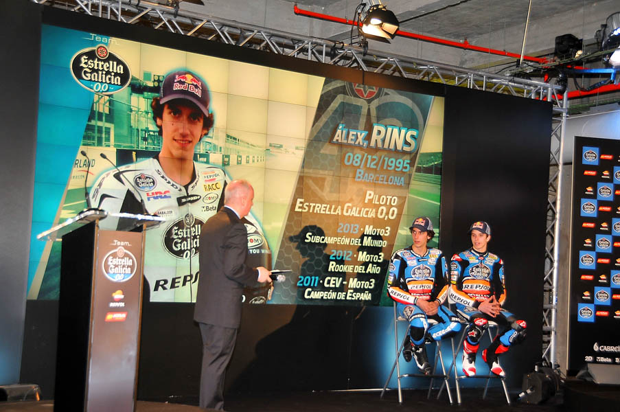 El edificio Media Lab de Madrid ha acogido la puesta de largo del equipo Estrella Galicia de Moto3, con el que Alex Rins, actual subcampeón del Mundo y Alex Márquez, rookie del año la pasada temporada, disputarán el mundial la temporada que está a punto de comenzar.