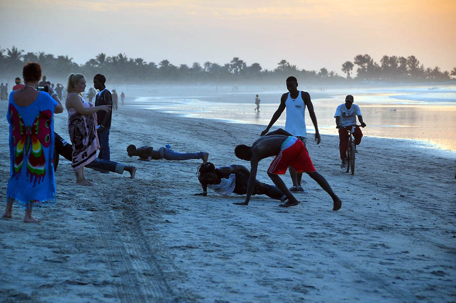 Ellos lucen sus atléticos cuerpos y hacen flexiones en la arena, ellas les fotografían, les dan indicaciones o sencillamente, los abrazan para fotografiarse con ellos, recorriendo con sus manos los fornidos cuerpos de una nada pudorosa forma. Mientras que el turismo sexual femenino no supone más del 5 o 6% del turismo sexual en el mundo, en Gambia llega a superar cifras del 20%.