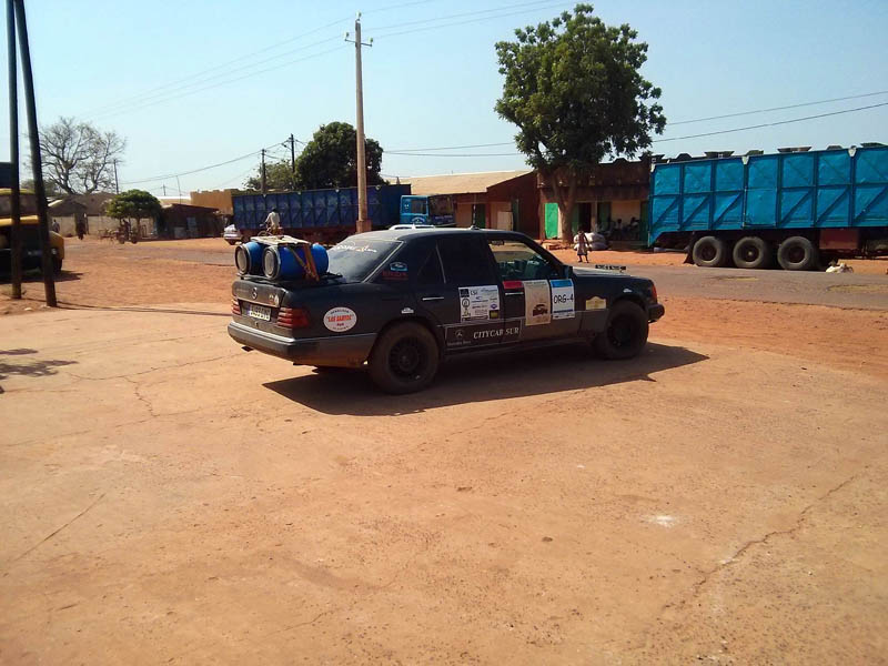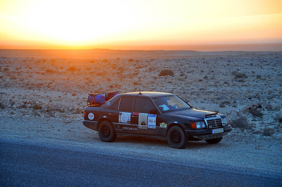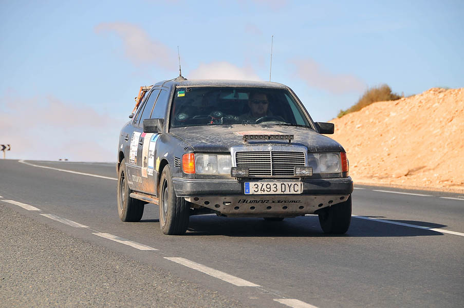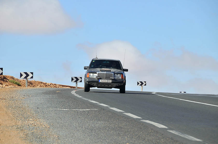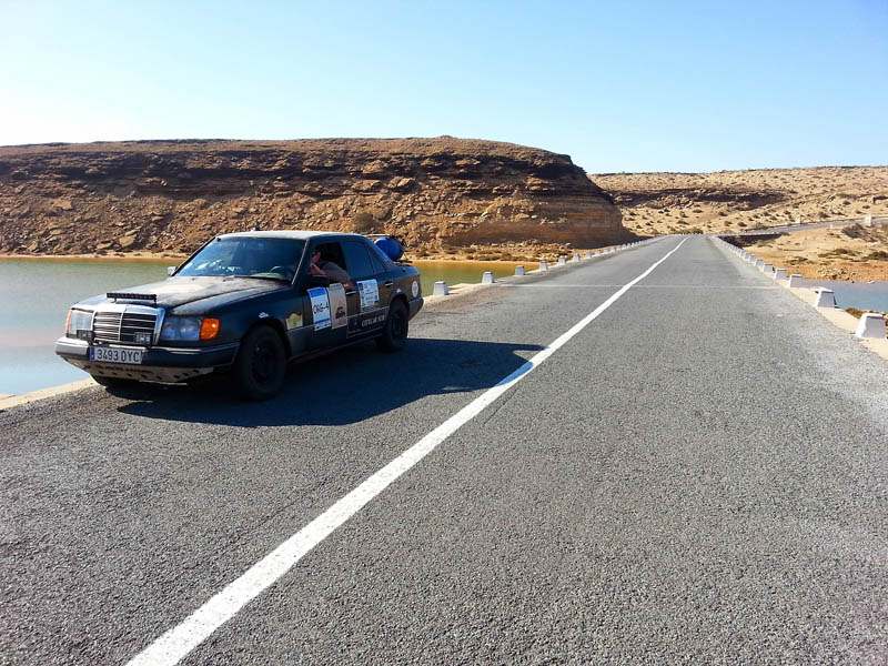 Miro a Jesús y le digo que voy a salirme de la carretera para comprobar daños; en una zona de arcén ancho, dentro del mismo pueblo, me salgo, y sin parar giro la dirección totalmente a la derecha, la giro totalmente a la izquierda… y no notamos nada. Le pregunto -¿paro y miramos?, y Jesús me dice -“sigue”… y seguimos. Ni una vibración, ni un desequilibrio… todo seguía con absoluta normalidad. Desde aquel momento ya se oficializó el nombre del coche: “el puto Mercedes” y se me confirmó por enésima vez, que el viaje iba a terminar gracias al blindaje que nos habían construido en Bumar Xtreme… la de cañas que le debo a Andrés.