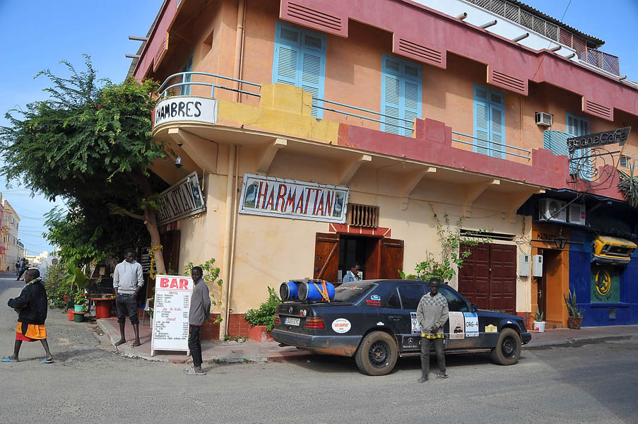 Alrededor de las nueve de la noche llegamos a Saint Louis, nos fuimos directamente al Harmattan, el hotel que habíamos cogido a la bajada, y tras dejar los bártulos en la misma habitación que la otra vez, nos fuimos a cenar estupendamente bien a un pequeño y acogedor restaurante con una corta pero exquisita carta y después, de nuevo en el bar del hotel, nos tomamos un Gin Tonic mientras disfrutábamos del ir y venir de la camarera.