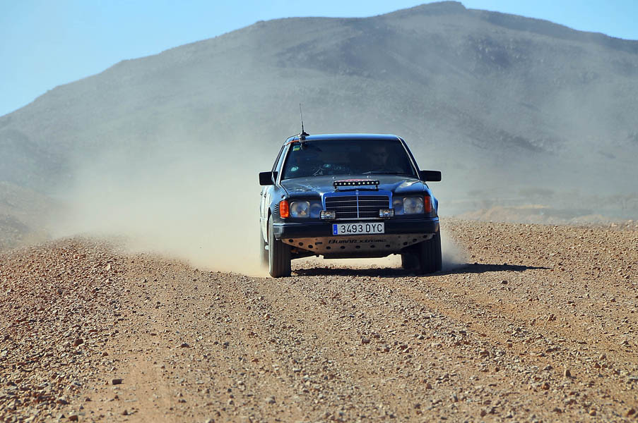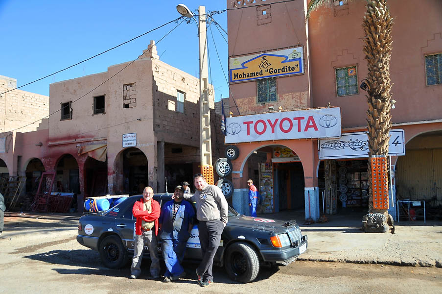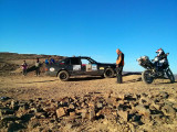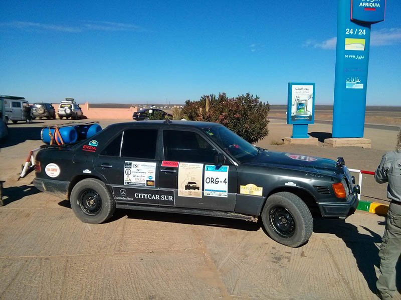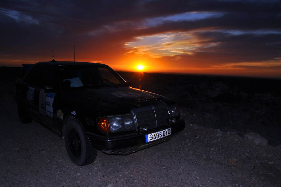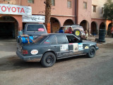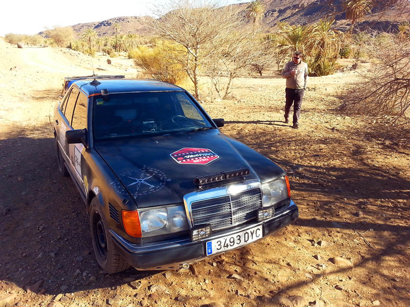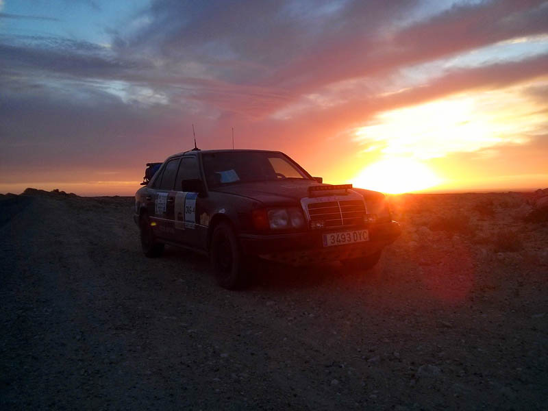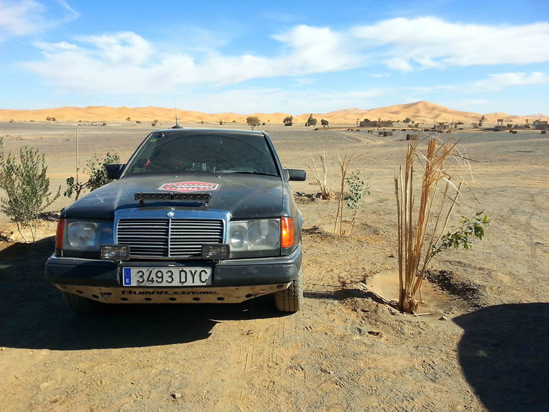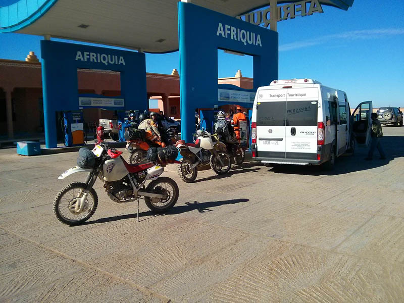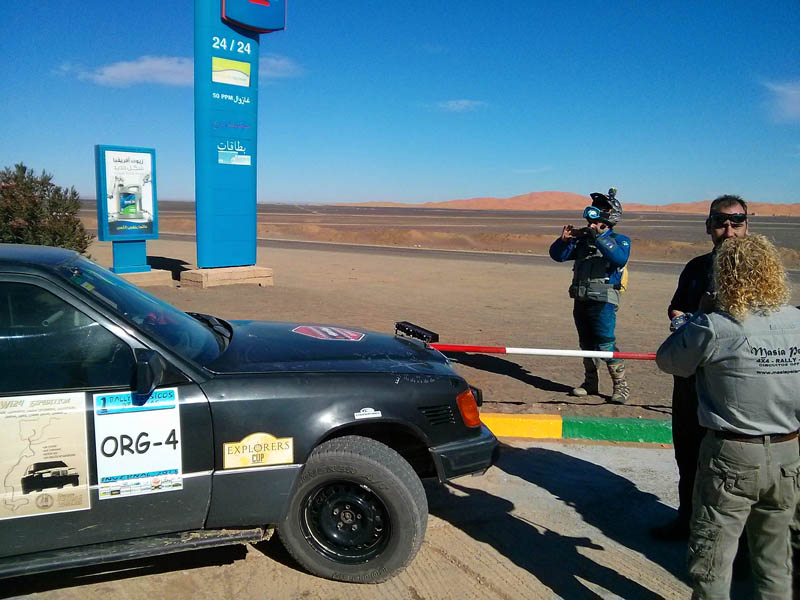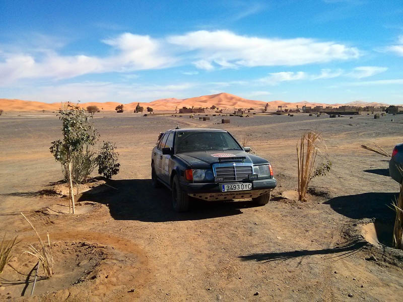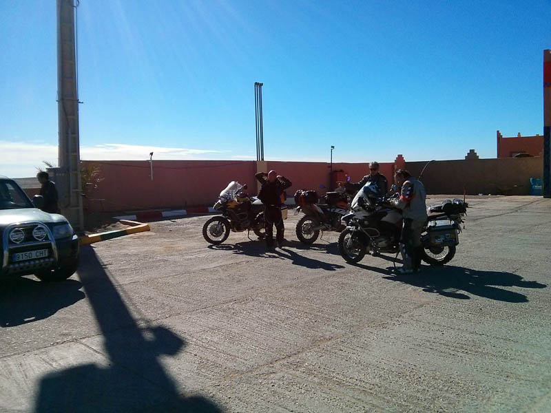 El primer día del 2014 nos levantamos tarde, la prisa que teníamos era “entre una y ninguna”, así que desayunamos con tranquilidad y recordamos que ese día pasaba la caravana del África Eco Race por la gasolinera de Merzouga, por lo que nos dirigíamos hacia allí para ver si veíamos algunos de los coches participantes, lo que no fue posible porque ya era muy tarde; en honor a la verdad hay que decir que nos importó más bien poco, por el contrario, estuvimos un buen rato de animada charla con un grupo de amigos que estaban viajando con varios todo terrenos y un camión camperizado.