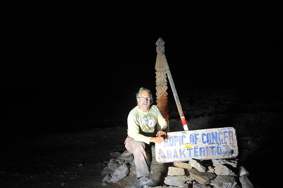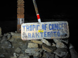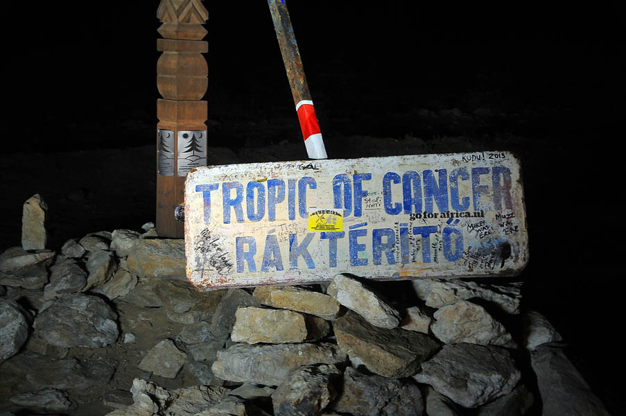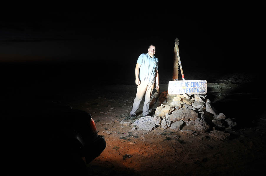 Según avanzamos, la noche va cayendo sobre nosotros, regalándonos una puesta de sol espectacular que nos hace detenernos cada pocos minutos para hacer fotos. Ya bien anochecido, alcanzamos el Trópico de Cáncer, donde de nuevo paramos a hacernos unas fotos con nuestras súper luces descubriendo, que en el lapso de tiempo que había pasado desde nuestra anterior visita, habían colocado unos carteles en la carretera indicando la localización del punto.