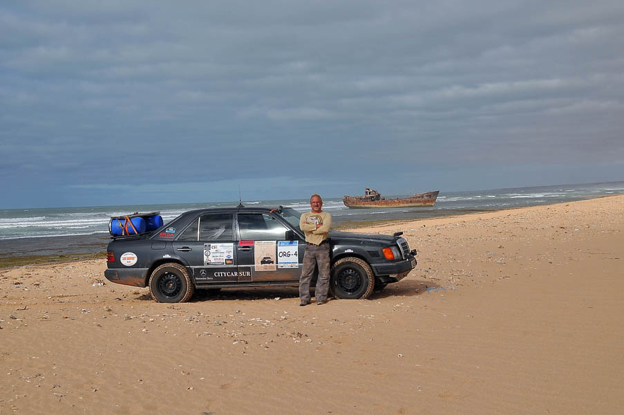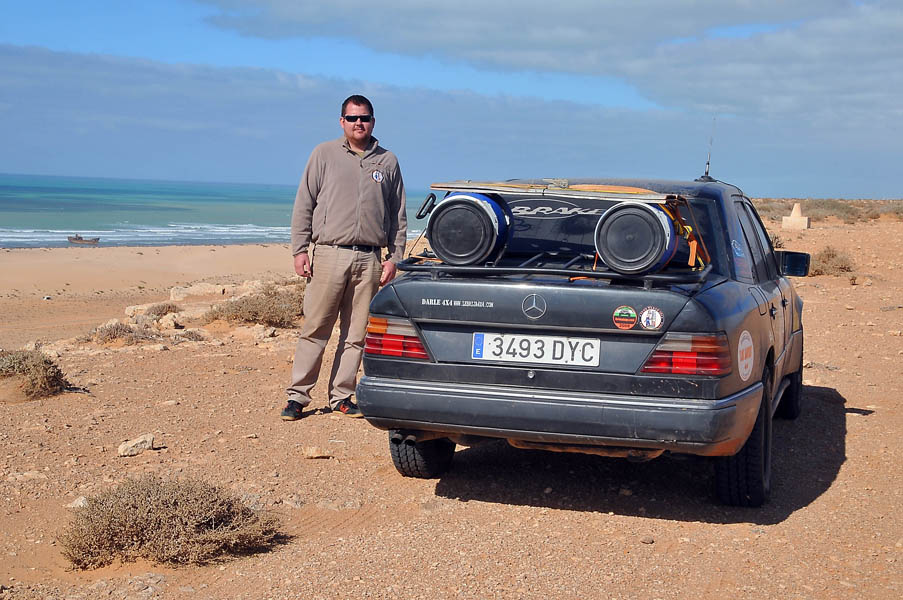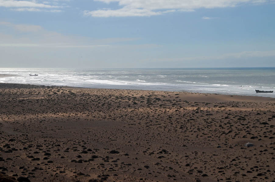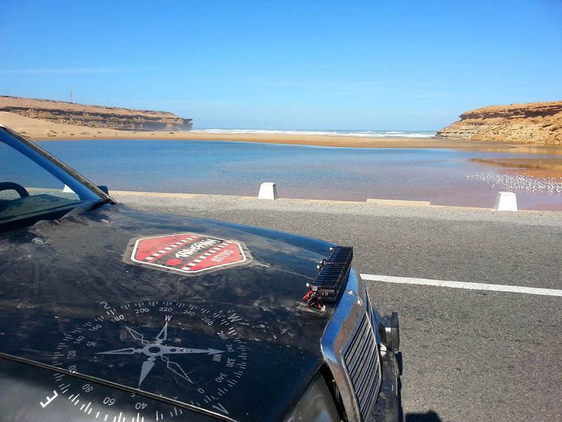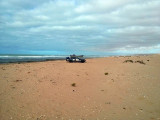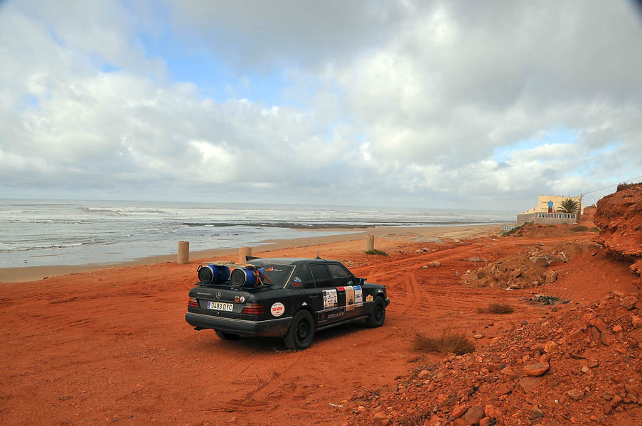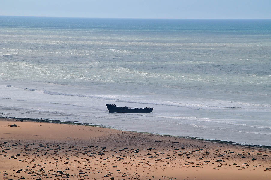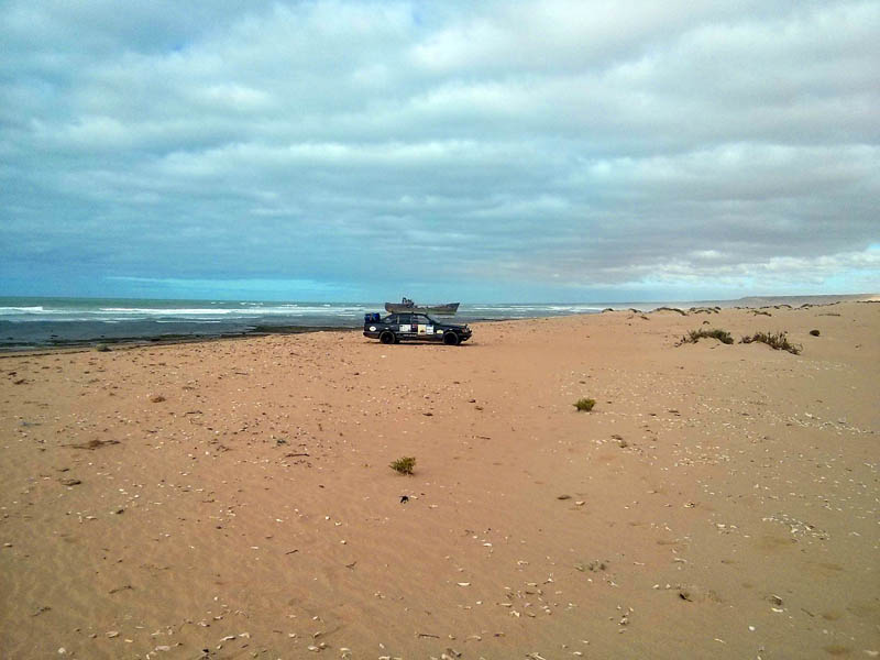 El sábado 28 de diciembre, nos levantamos, nos pegamos un buen desayuno y salimos en dirección a Sidi Ifni, todavía nos encontramos con varios controles y en uno de ellos, vemos que sale una pista a la izquierda, hacia la playa, donde a lo lejos vemos un barco varado, le preguntamos al policía si podemos pasar y nos dice que si, pero que no nos quedemos a dormir, le decimos que no, que solo será un rato y bajamos “hasta la cocina”. Tan hasta la playa nos metimos que no faltó mucho para que nos quedásemos empanzados, dejando una huella en la arena de la playa, algo más que profunda, de nuevo los bloqueos nos habían vuelto a salvar, amo este coche.