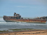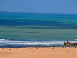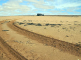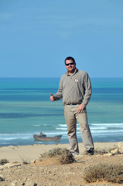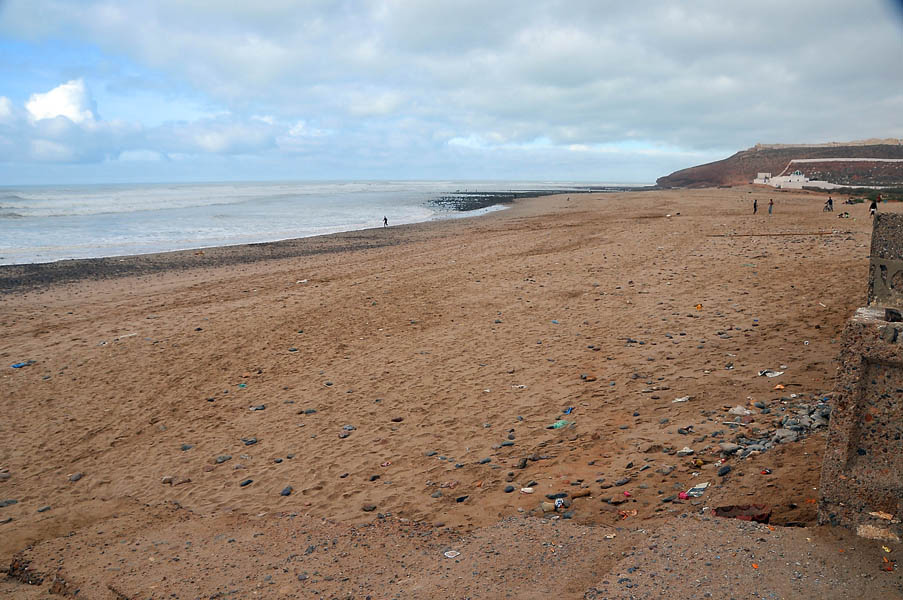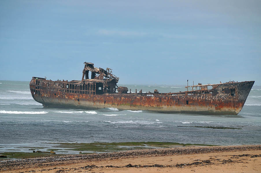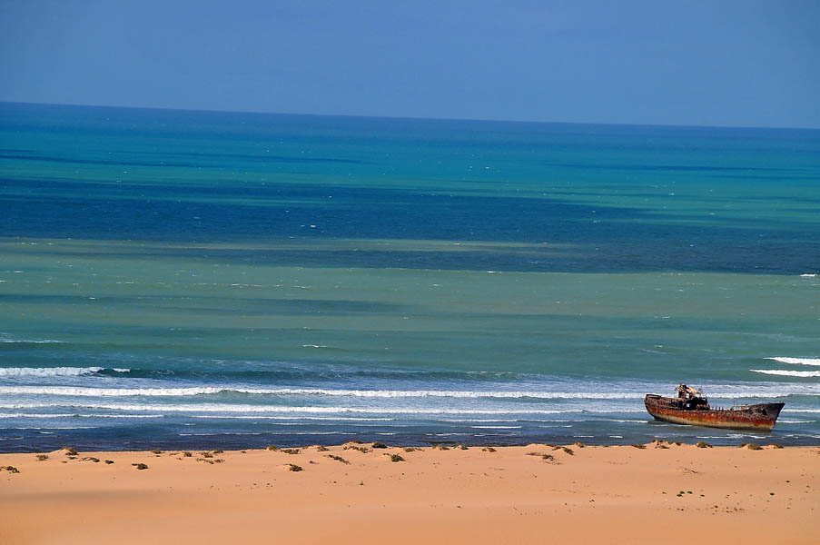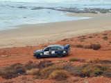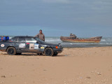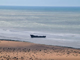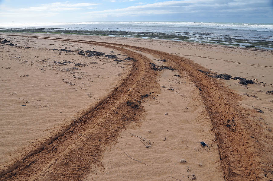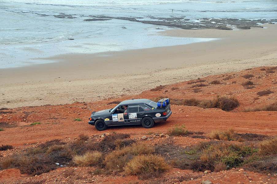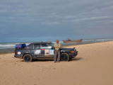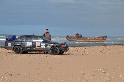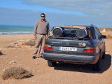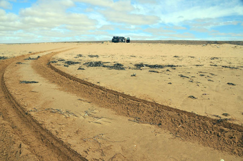 El sábado 28 de diciembre, nos levantamos, nos pegamos un buen desayuno y salimos en dirección a Sidi Ifni, todavía nos encontramos con varios controles y en uno de ellos, vemos que sale una pista a la izquierda, hacia la playa, donde a lo lejos vemos un barco varado, le preguntamos al policía si podemos pasar y nos dice que si, pero que no nos quedemos a dormir, le decimos que no, que solo será un rato y bajamos “hasta la cocina”. Tan hasta la playa nos metimos que no faltó mucho para que nos quedásemos empanzados, dejando una huella en la arena de la playa, algo más que profunda, de nuevo los bloqueos nos habían vuelto a salvar, amo este coche.
