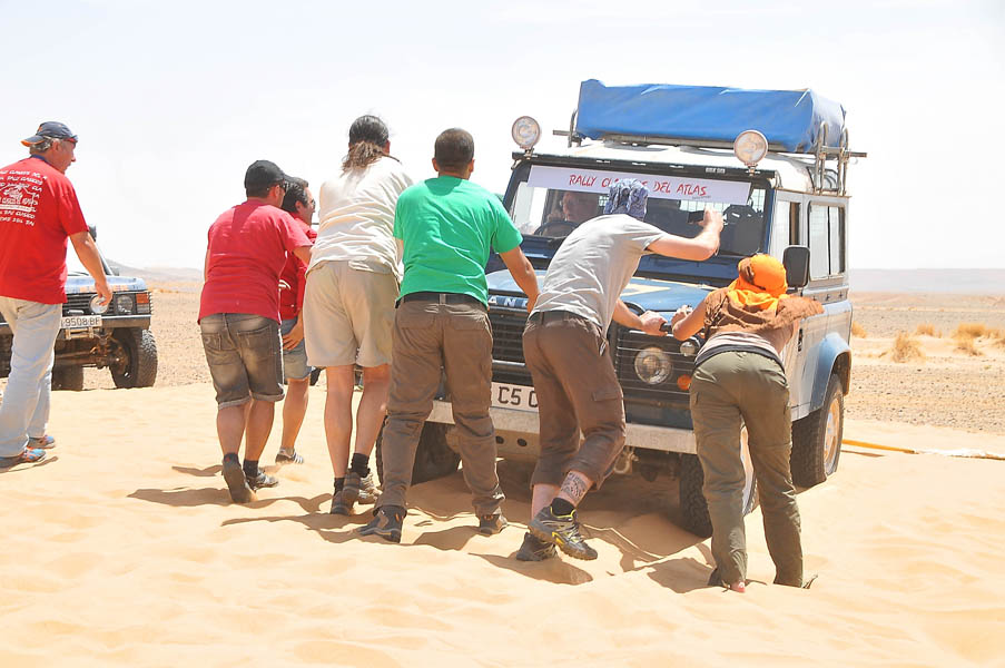 La cuarta etapa se componía de 85 Km. a realizar en 180 minutos con llegada en las dunas del Erg Chebbi, aunque finalmente la etapa no resultó excesivamente dura, no comenzaba así, y a poco de tomar pista, una subida que culminaba en un río de arena “atrapaba” a casi la totalidad de los 4×2, que de nuevo se veían obligados a tirar de implementos, compañerismo y la solidaridad de los pocos 4×4 más retrasados, que de nuevo resultaron vitales para ahorrar buenas dosis de sudor a sus compañeros.