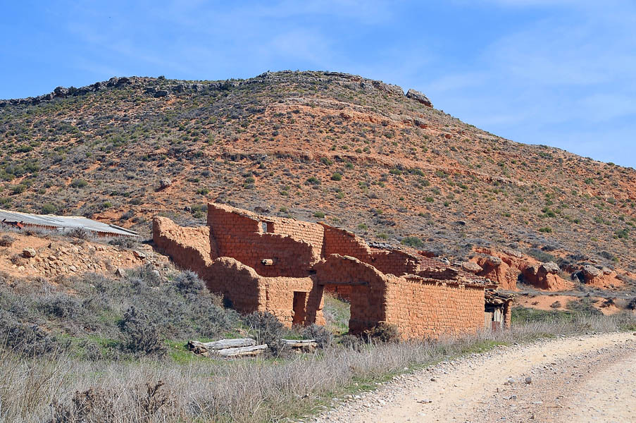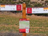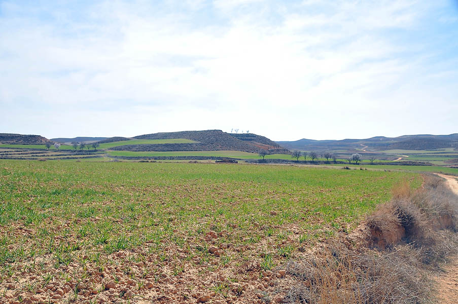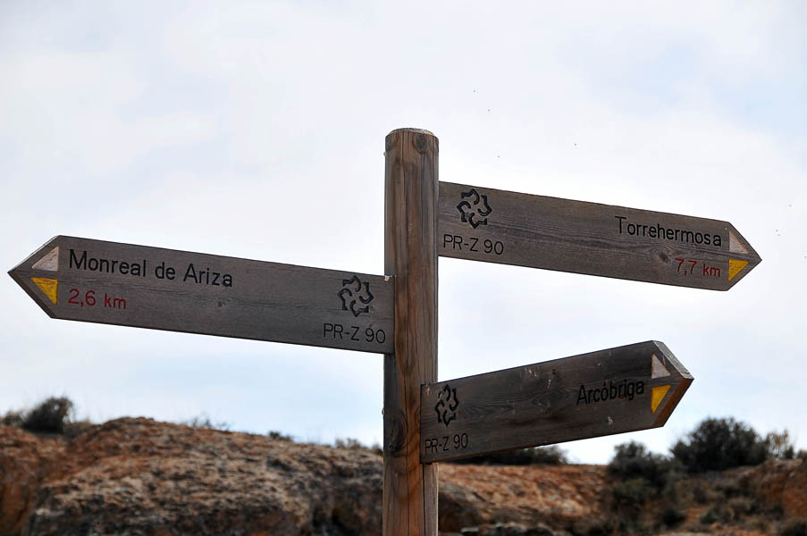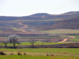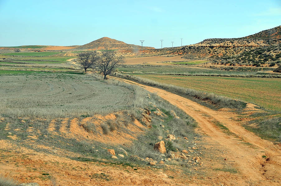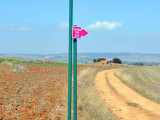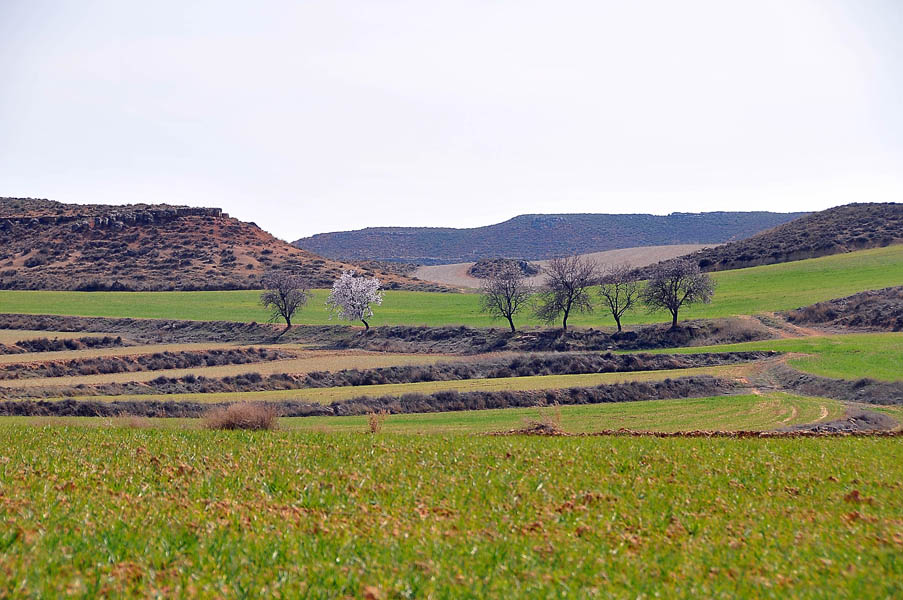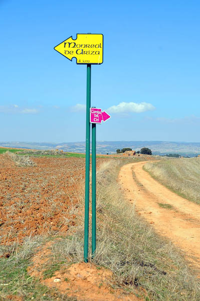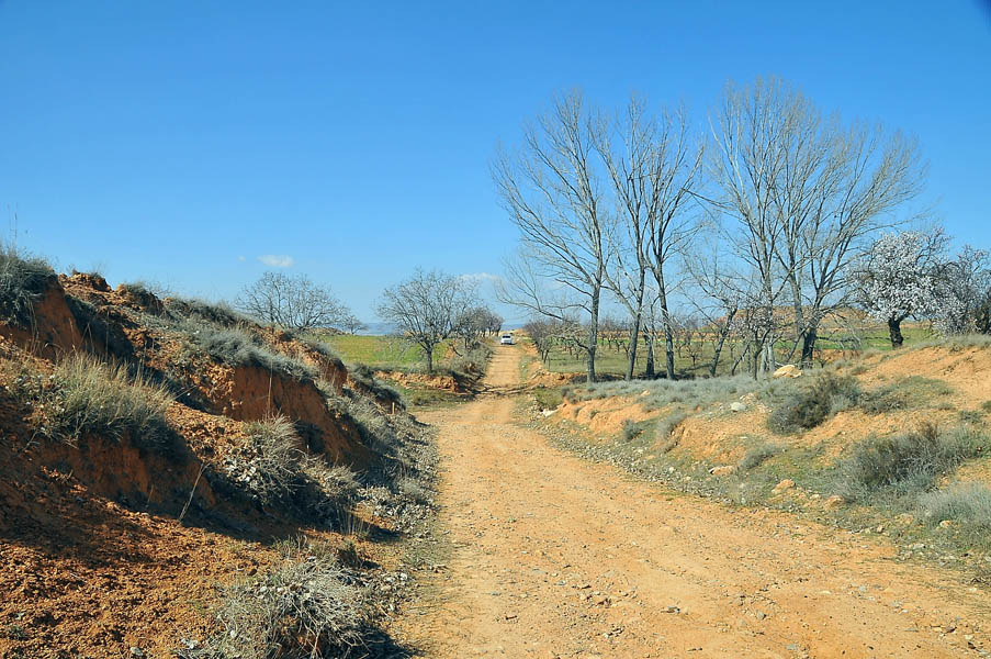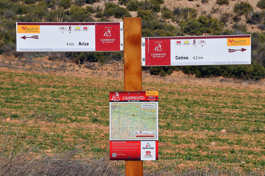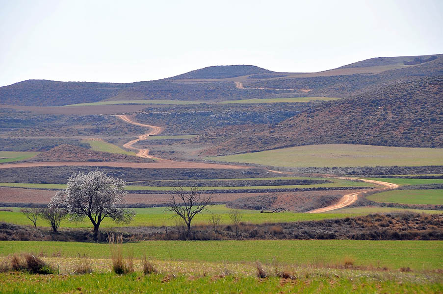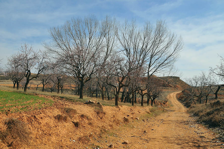 Verdes campos, almendro en flor, sencillas pero solitarias y relajantes pistas nos llevan a encontrarnos con señales que nos recuerdan que estamos en el Camino del Cid.
