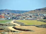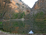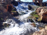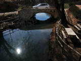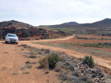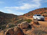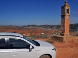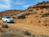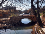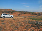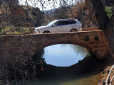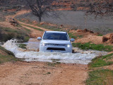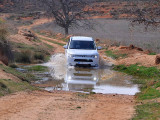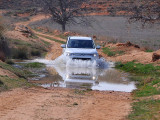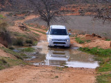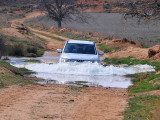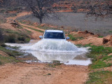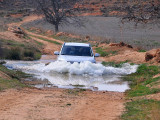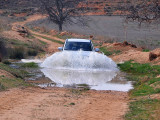 Poco después de aparecer esta imagen en la lejanía, nos encontraremos con un curioso vadeo. Tras parar para comprobar su profundidad, vemos a través de sus claras aguas que el fondo es de cemento, por lo que decidimos pasar sin más, sin embargo, la V de cemento se hunde más de lo que parece, haciendo que el coche levante una espectacular ola a pesar de haberlo atravesado despacio.