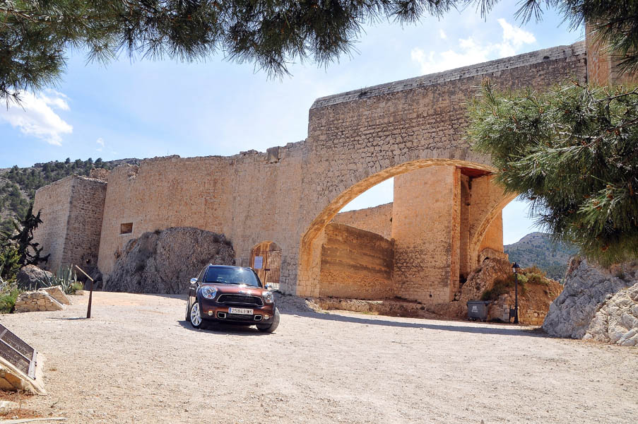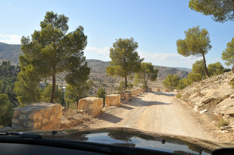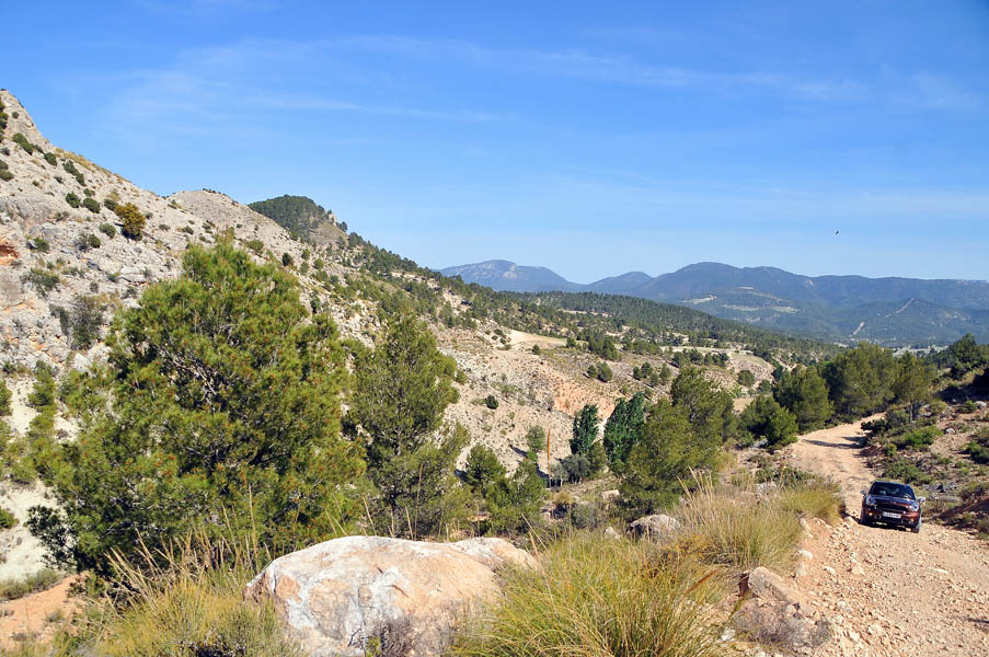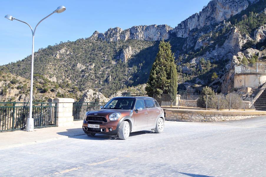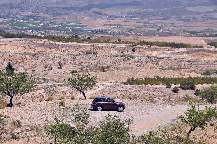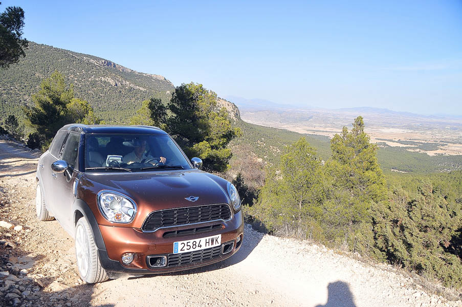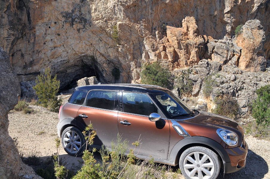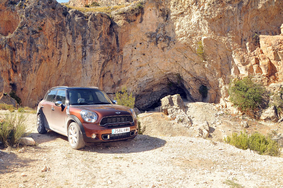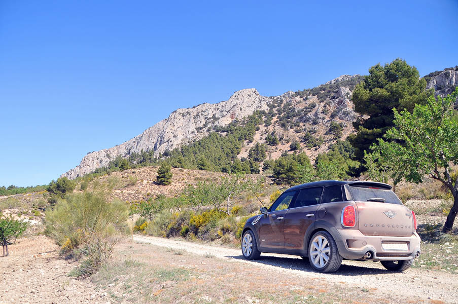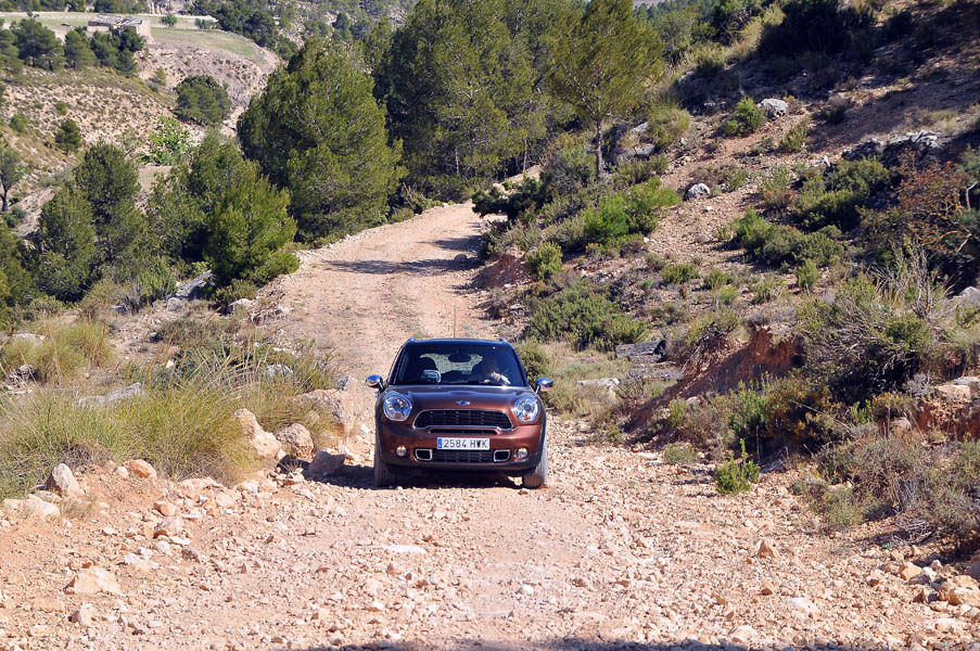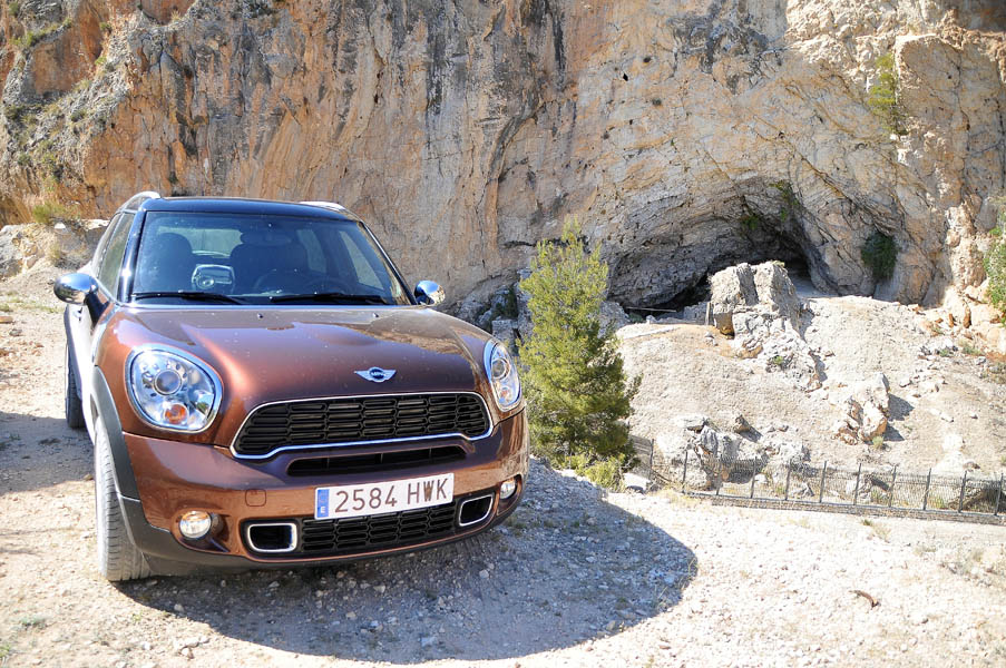 La pista que anteriormente se había estrechado, se vuelve a ampliar y nos va llevando hasta la Cueva Ambrosio, a la que se accede por una pista mala, de grava suelta, que hace entrar en funcionamiento el sistema de tracción del Mini que sigue avanzando sin problemas hasta el final de la pista desde empieza la bajada para acceder al interior de la cueva.
