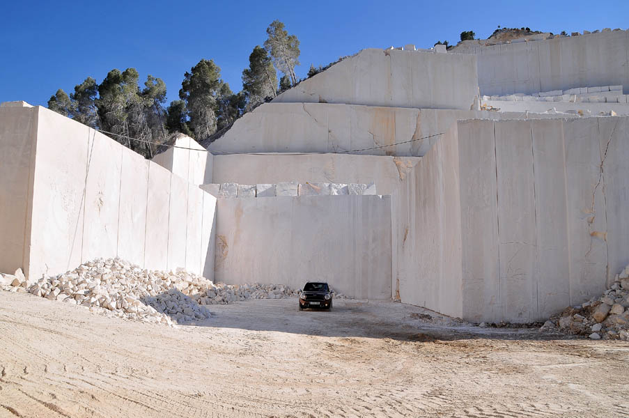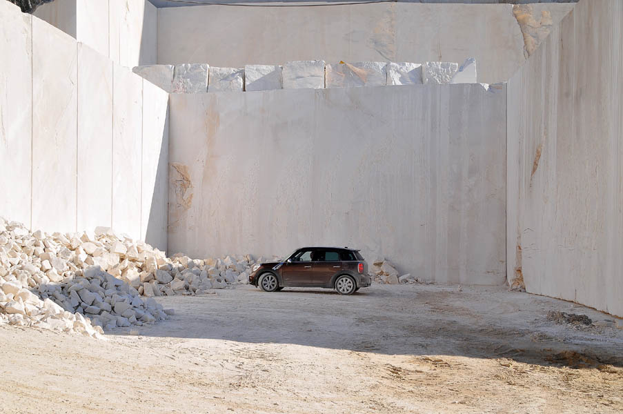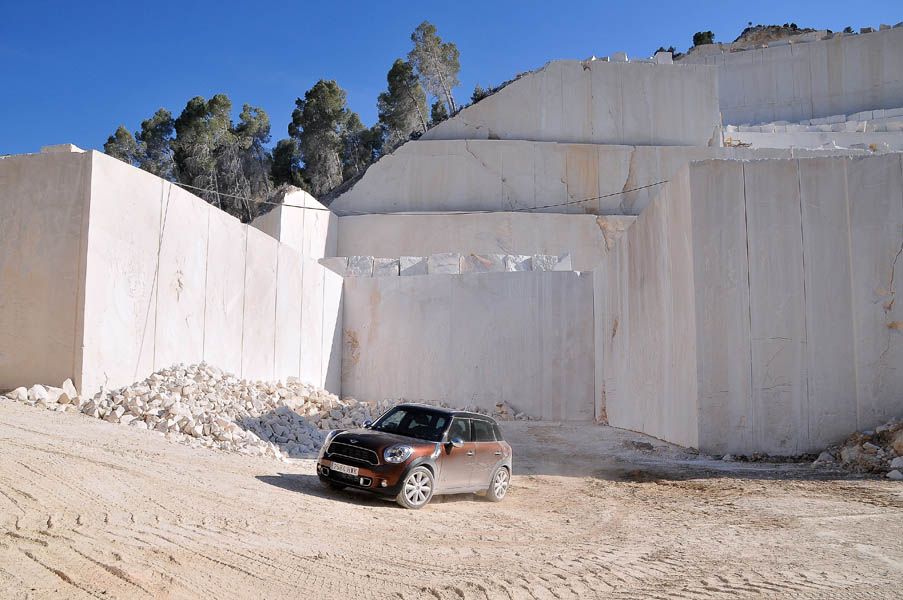 Deshacemos nuestros pasos y de regreso, pasamos junto a la entrada de una de las canteras de mármol blanco, donde fotografiamos nuestro Mini junto a los enormes bloques de mármol que tanto nombre le han dado a toda la comarca.