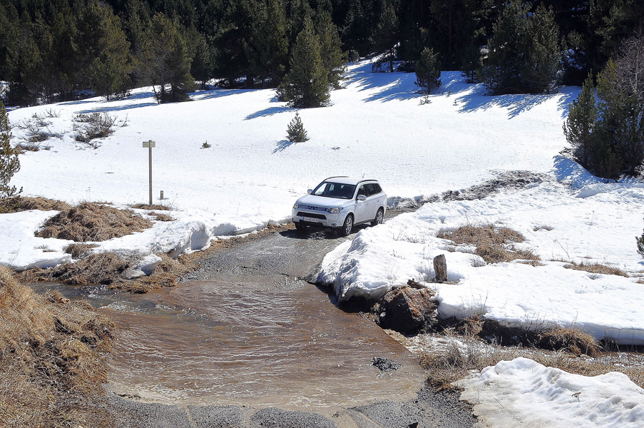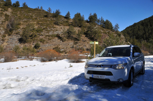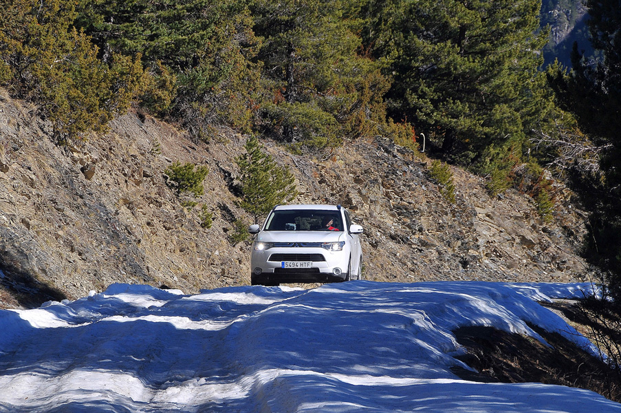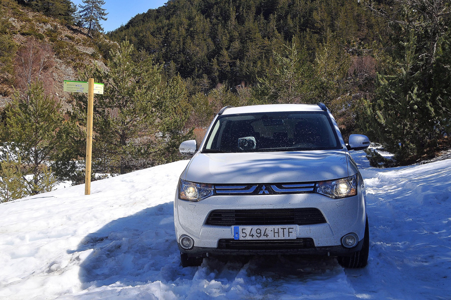 Aquí es donde encontramos las mayores dificultades, llegando a empanzarnos en varias ocasiones y teniendo que sacar “todo” de cuanto era capaz el Outlander. Botón “4WD Lock”, fuera control de tracción, fuera control de estabilidad, intentos hacia detrás y hacia delante para irle ganando metros a la nieve… el objetivo estaba prácticamente cumplido y, de hecho, de dar la vuelta, algunos de los tramos helados que nos encontramos en bajada podían ser tramos infranqueables al atacarlos en subida… había que seguir…