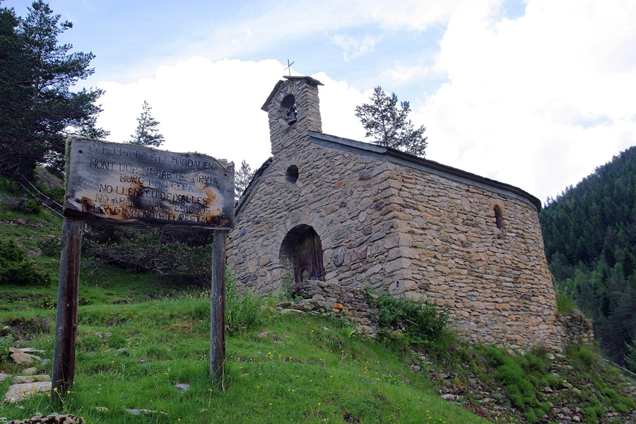 Finalmente, lo más difícil pasó y alcanzamos la Capilla de Santa Magdalena, Santuario y antiguo hospital del municipio de Farrera, en medio de unas laderas dominadas por el verde y en el que era imposible atisbar el más mínimo rastro de nieve.