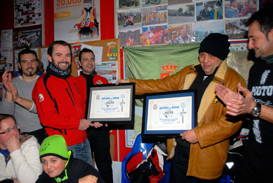 En esta comida, pudimos hablar de auténticos viajes con el Búfalo KTM o con Víctor Rider; tuvimos tiempo para que se nos pusieran los pelos como escarpias y “nos entrase un mota de polvo en el ojo”, escuchando cantar a Panin Solarana la canción “Viento del Norte”, un emocionante tema cántabro; asistimos a la entrega de trofeos del Desafío, que en este edición fue para Javi “el bujías” y Pedro Raba, Capitán de Ruta del Desafío, quienes además de los diplomas, se llevaron cada uno medio calzoncillo del Rockie del Desafío, Raúl Minando (el rockie realiza el viaje sin calzoncillos…), pudimos ver llegar, también desde Cantabria a Verónica San Miguel, Presidenta de la Peña “Moveros Moteros” a quién fotografié junto al centímetro de hielo que traía acumulado en el retrovisor de su moto… no hubo Pingüinos, pero si había auténtic@s moter@s.