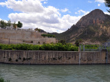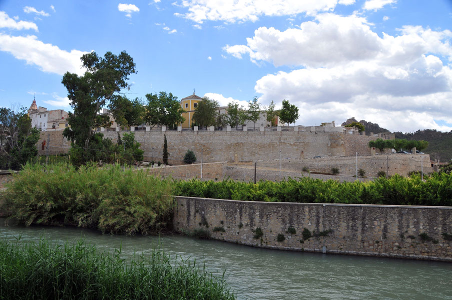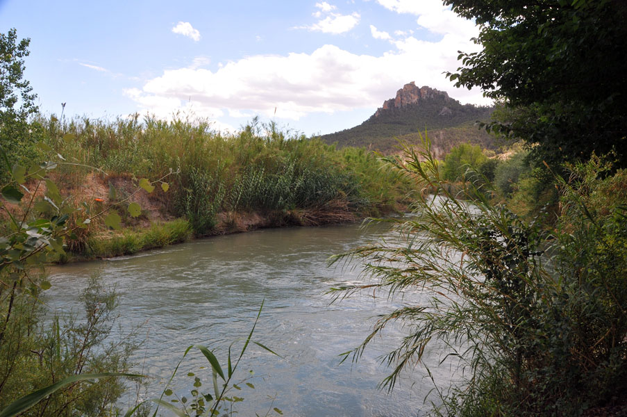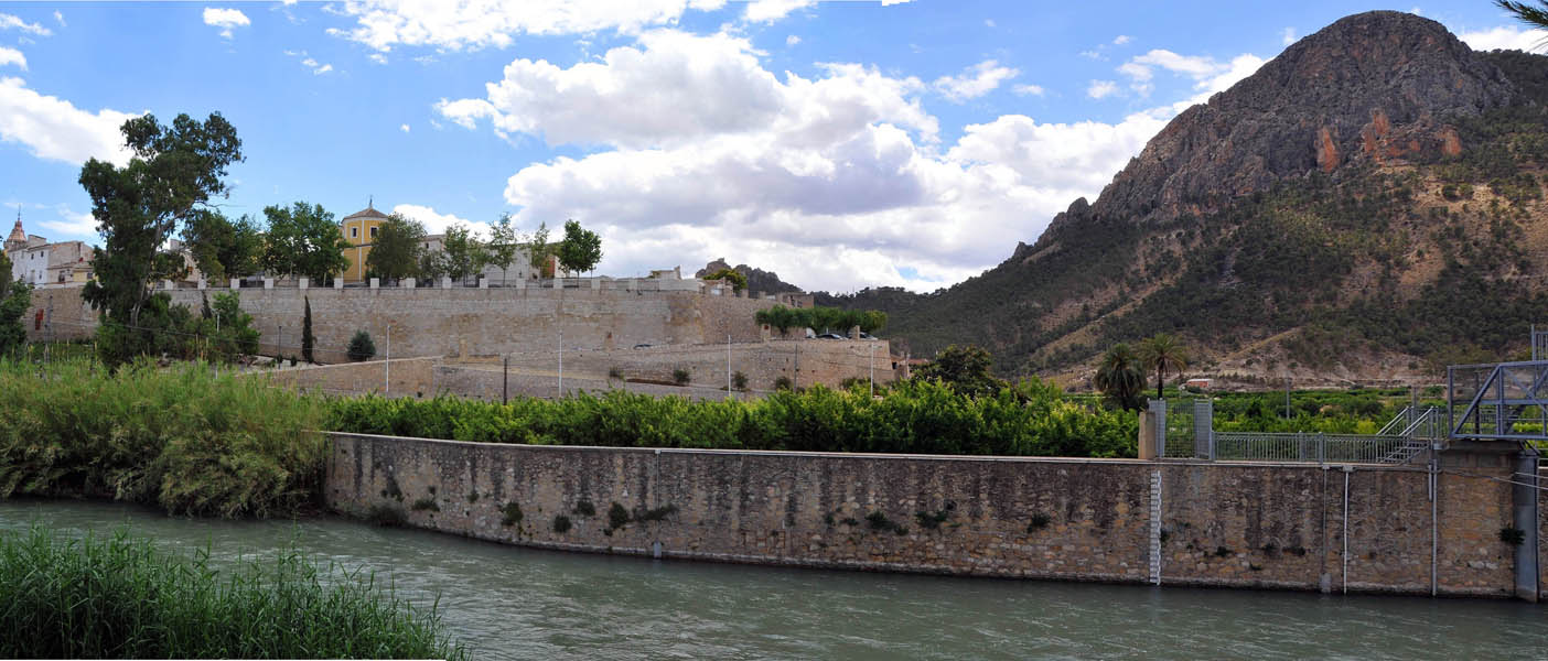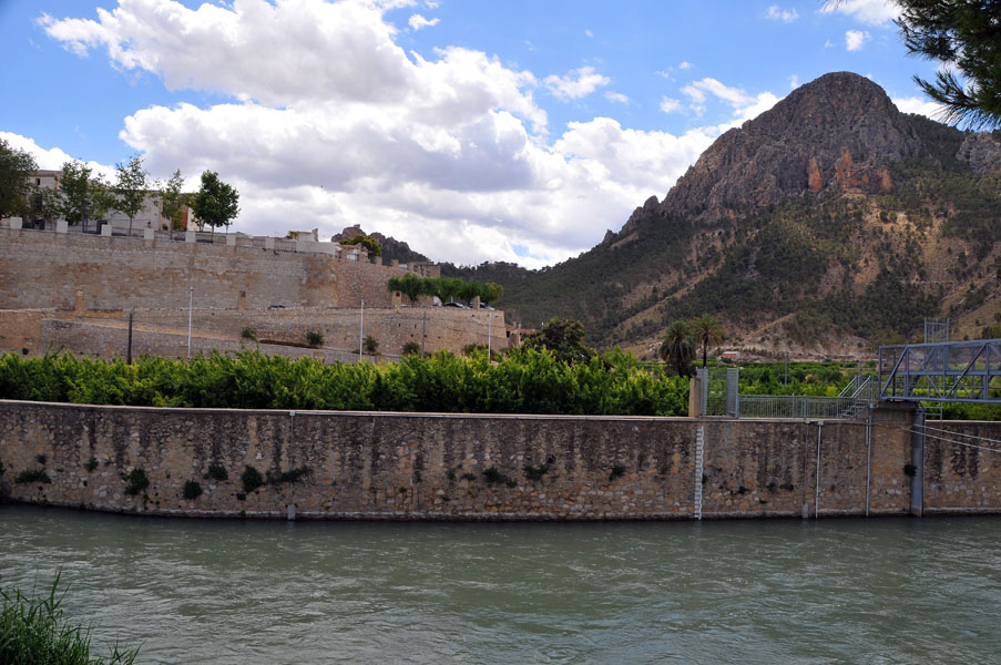 Nosotros “vadeamos” dos de sus brazos, el primero totalmente seco y el segundo con un pequeño caudal tras lo cual, la pista nos va elevando hasta un punto en el que, a la distancia, tenemos nuestra primera vista de Calasparra.