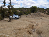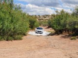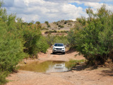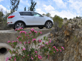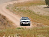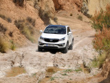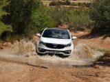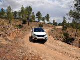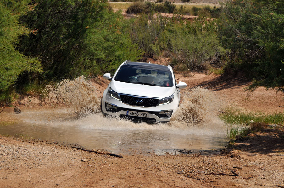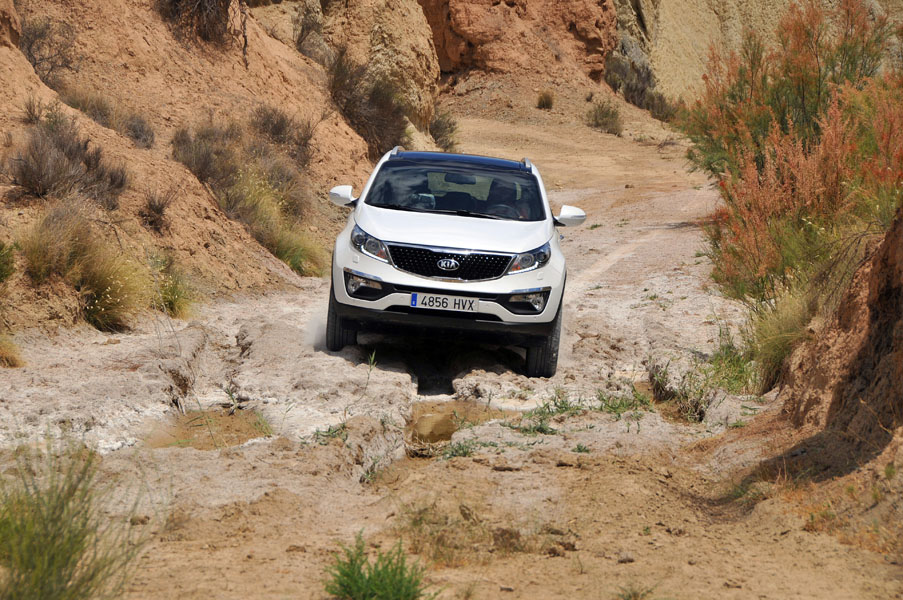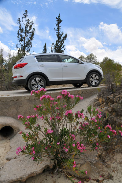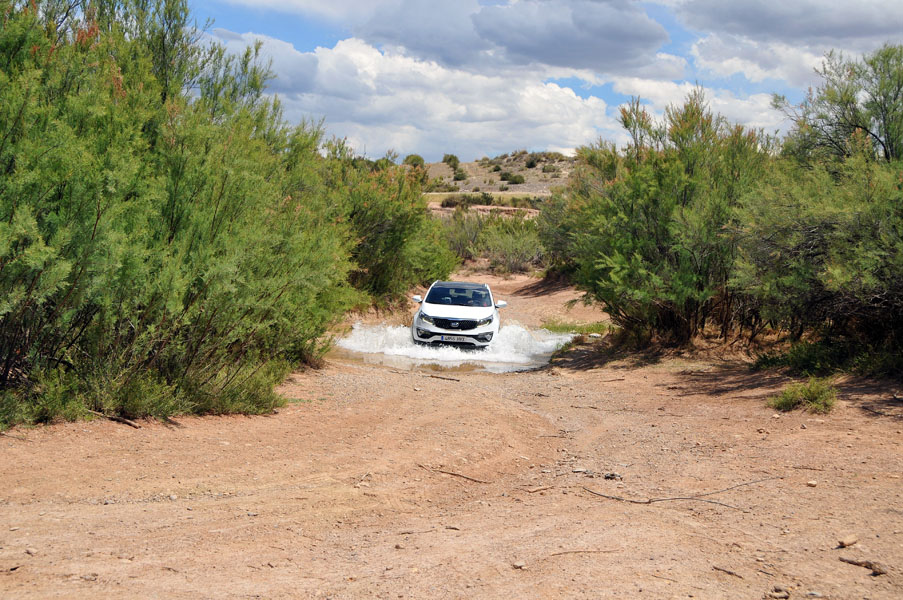 La pista se va complicando a ratos. Siempre en subida, los regueros provocados por el agua hacen trabajar todo el recorrido de las suspensiones del Sportage, que se va comportando perfectamente y que se va comiendo los desniveles sin despeinarse, finalmente, nos termina de convencer en una subida, en curva a izquierdas, con bastante tierra suelta donde para continuar había que superar un reguero que dejó al coche en un completo cruce de puentes, al ser capaz de, con suma facilidad, gestionar que la tracción llegase a la rueda de cada eje apoyada en el suelo y seguir avanzando con apenas un leve derrape de las ruedas sin tracción.