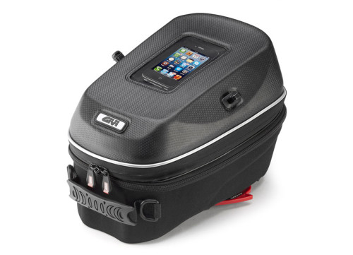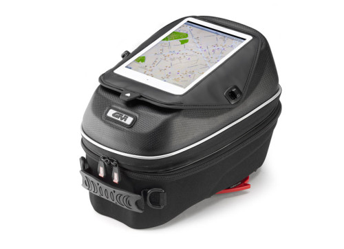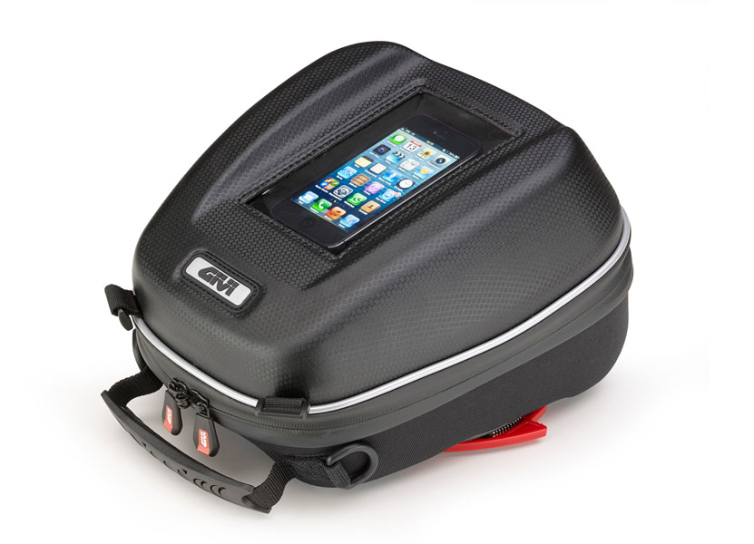 Este sistema, totalmente compatible con la mayoría de bolsas sobre depósito de GIVI, consiste en un pequeño anillo metálico fijado a la base de la bolsa y otro en el depósito de la moto (por medio de tres tornillos). Para colocar la bolsa se hace presión hasta escuchar un pequeño click. Para retirarla, basta con accionar la palanca que se encuentra en la base de la misma.
