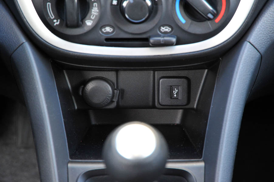 En el centro de la consola encontramos el radio CD, debajo de este los mandos de la climatización y el A/A y más abajo, en el interior de una pequeña guantera, la toma de corriente y la toma USB.