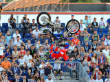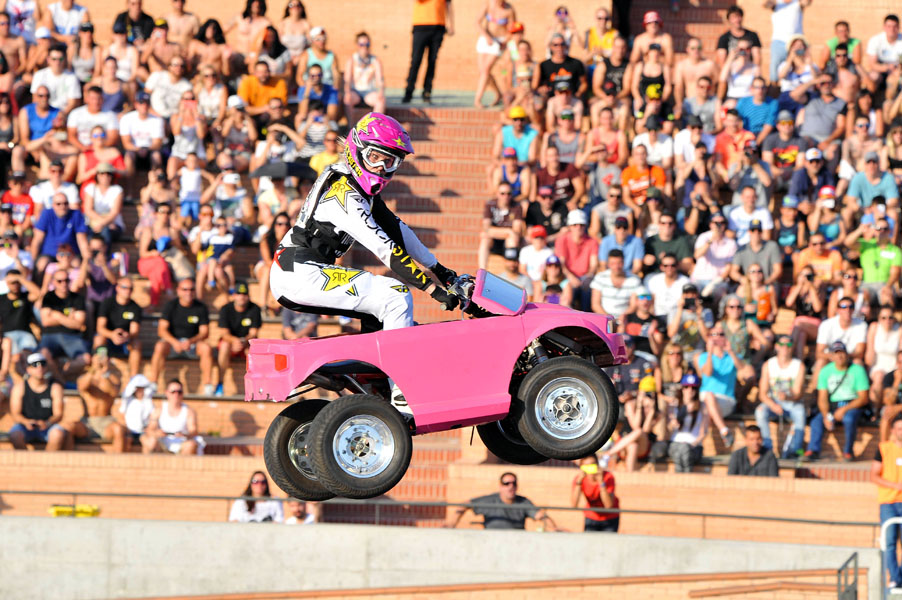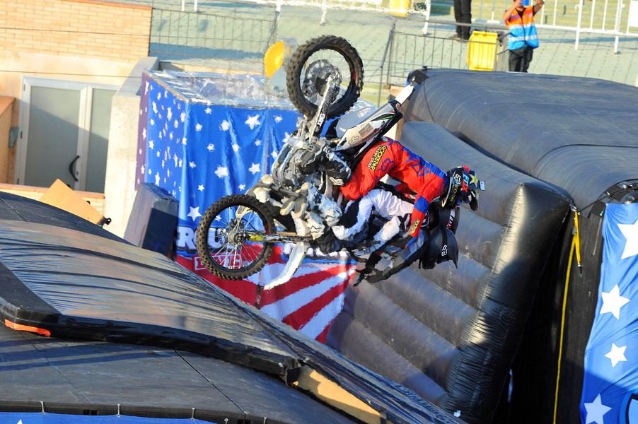 Rock Solid, Cordobés, Whip, BackFlip, Superman, Indian, Seat Grab, Kiss of Death, Tsunami, Shaolin Flip… fueron algunos de los trucos (toda una colección como podrás ver en las fotos), que se ocuparon de que la boca se nos llenase de moscas, aunque para ello, hay que reconocer, que estuvieron realizados por algunos de los mejores especialistas, y además del propio Pastrana, la lista de excepcionales pilotos era tan increíble como el propio espectáculo, y entre ellos encontramos a Josh Sheehan, campeón del Red Bull X-Fighters 2014; Cameron Sinclair, del que muchos se acordarán por ser el piloto que en el Red Bull X-Fighters 2009 de Las Ventas, sufría un grave accidente al intentar un doble backflip y que en el Nitro Circus hace un Backflip con dos voluntarios montados en su moto o Jolene Van Vugt, que fue la primera mujer en realizar un Backflip en una moto, que ha sido la primera en realizarlo en España y que además, también se atreve a volar con el coche de Barbie y hacer tamdems con algunos de sus compañeros.