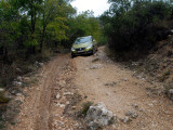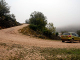 En una subida con curva a izquierdas, el coche se va contra las zarzas del borde. Hacia arriba es imposible continuar. Hacia atrás hace por salirse más de la pista. Unas ramas en la rueda trasera izquierda y un empujón consiguen colocar el coche de nuevo dentro de la pista, que tras la curva a izquierdas nos espera con un pronunciado escalón justo antes de una curva a derechas. Solo queda coger toda la inercia posible y, sin ningún convencimiento atacar el obstáculo.