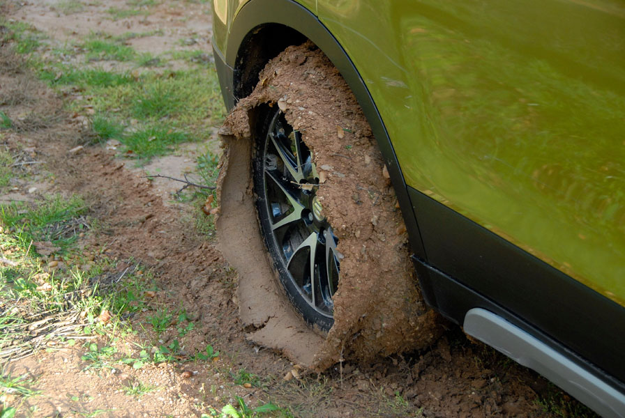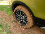 Seguimos cuesta arriba en una pista totalmente impracticable para un SUV con neumáticos de serie de la única manera posible, no perdiendo la inercia y por lo tanto, no pudiendo llevar el coche justo por “el carril” que nos interesa. Más deprisa de lo deseable, en una subida con piedras ocultas por el barro y con unos neumáticos 205/50-17 ocurrió lo único que podía ocurrir: pinchazo al canto.