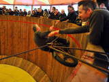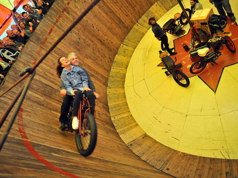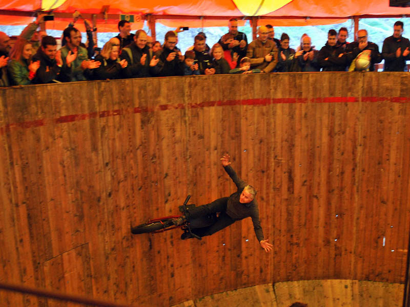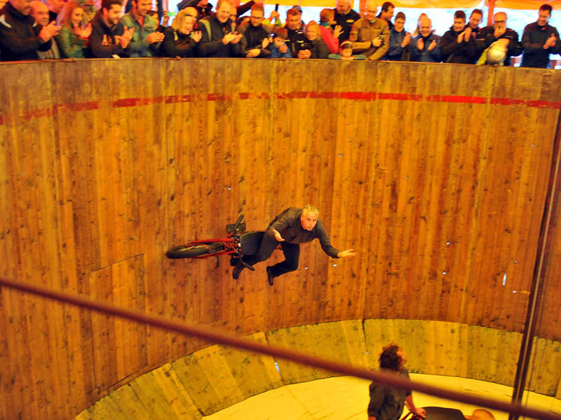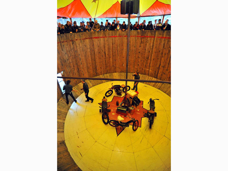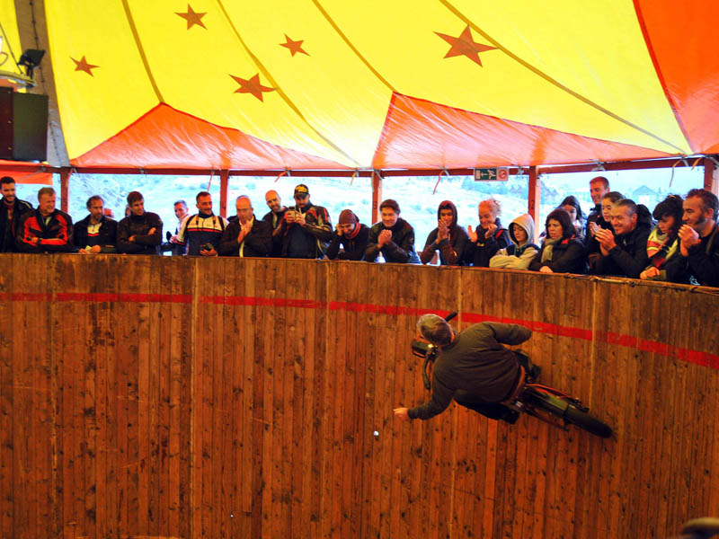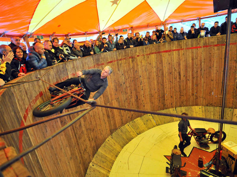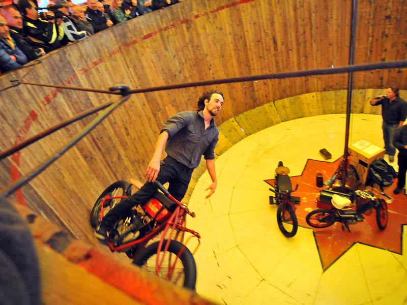 Siguiendo con las novedades, quizás la más destacada fue el Motordrome, un espectáculo que llegaba por primera vez a España y en el que un par de “chalados” a lomos de sendas Indian circulan por ¡las paredes! interiores de un cilindro… y no solo eso, sino que se ponen de pie, se tapan los ojos, se dan la mano de moto a moto, o le “quitan” de la mano al publico los billetes que estos les ofrecen. Sin duda un espectáculo digno de ver, que marea solo con verlo y que como no podía ser de otra forma, estuvo “petado” en todos y cada uno de sus pases.