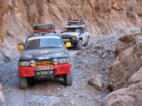 En una de estas ocasiones me tocó ir a buscar a cinco participantes que, tras elegir la pista errónea, se introdujeron en las montañas que daban paso a la Hammada du Guir; en un primer momento, localicé a tres, que estaban parados solucionando la avería de uno de ellos. Seguí por la única pista posible y varias veces estuve a punto de darme la vuelta porque por allí “era imposible” que un Renault Clío y un Citroën AX hubieran podido pasar… hasta que desde un alto, los localizo, un monte más allá de donde yo estaba, con una bajada y una subida de vértigo por medio… Tras llegar hasta ellos e indicarles el camino bueno, una vez más me volví a quedar sorprendido de hasta dónde pueden llegar estos pequeños coches y me vienen a la cabeza toda esa cantidad de amigos, que con un TT preparado “hasta las trancas”, no tienen claro si su coche está “listo para bajar a Marruecos”… menos preparación y más Km. les digo yo siempre…