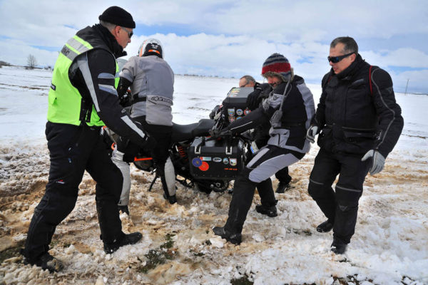 No fue hasta las 12´00. que gracias al tractor de Daniel, vecino de Bercimuel, se pudo abrir el camino a las Trail… Así se inauguró la prueba de la Gymkana KTM. No hubo que lamentar desgracias aunque no se reconocía la matrícula de las motos por el barro. Fue una pareja de Cántabros la que superó con elegancia y sus BMW GS, la Gesta de los Caballeros.Mamuts 06