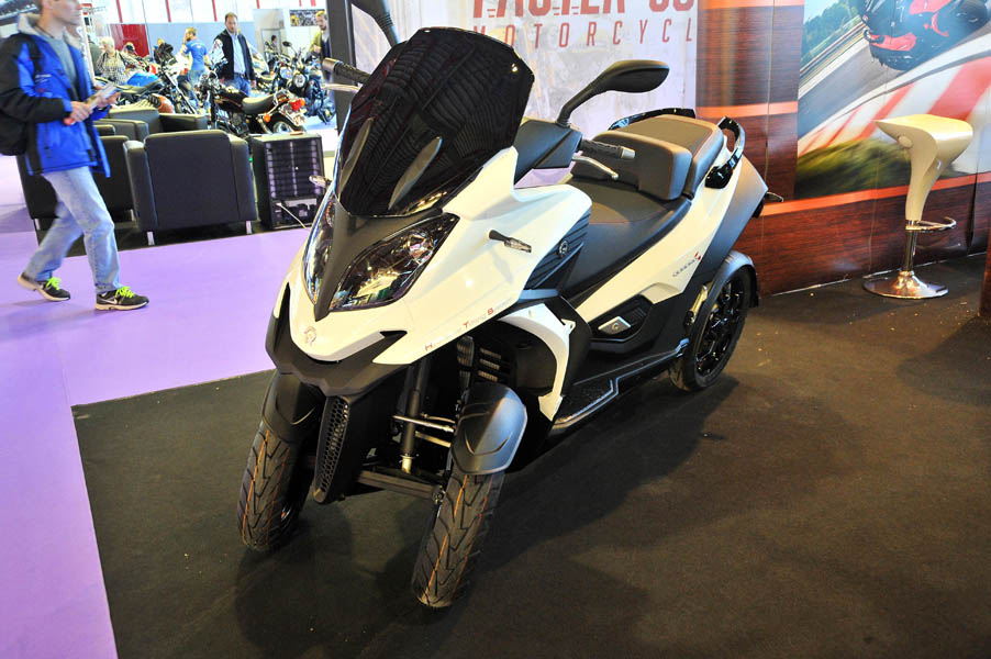 Sin mucho bombo y con menos platillo, el salón también acogía el stand de la marca Quadro, en el que se podían ver el nuevo Quadro3 (de tres ruedas), y el esperadísimo Quadro4 (de cuatro ruedas), ambos aptos para el carnet B y, en el caso del Quadro4 lo que podríamos llamar la primera moto de cuatro ruedas (se monta a horcajadas, tiene manillar y llega a inclinar hasta 45º), ambas equipadas con el sistema de suspensión HTS Hydraulic Tilting System, una suspensión hidroneumática que hace que las ruedas oscilen simultáneamente. El motivo de no hacer mucho ruido es que los responsables de la marca están esperando a inaugurar su primera tienda monomarca en Madrid, algo que sucederá el próximo mes de abril.