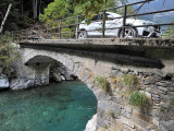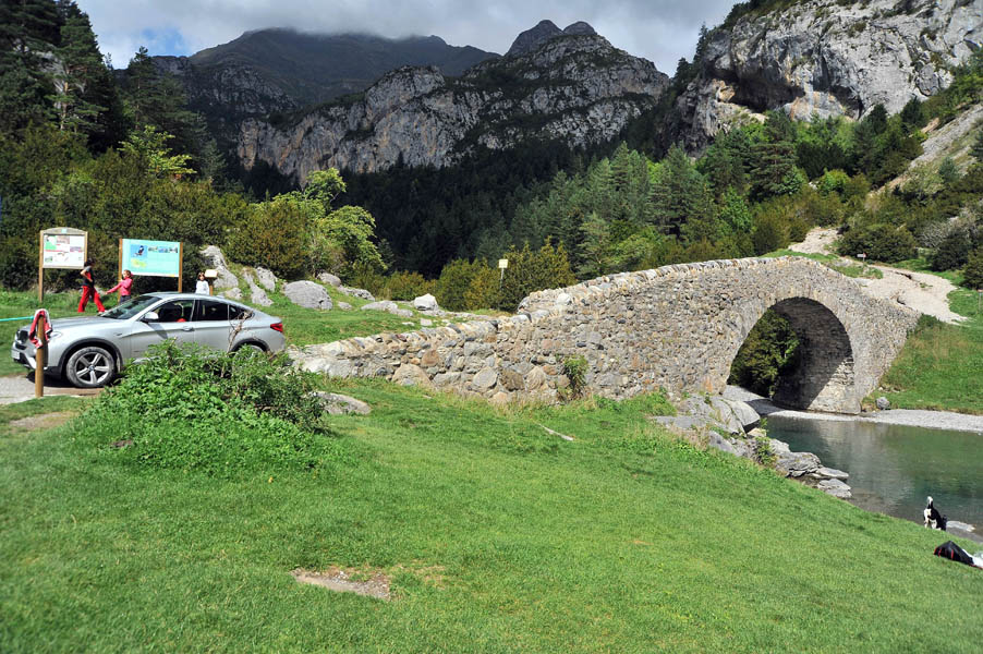 Justo enfrente de la carretera que nos llevaría al interior del parque, carretera con trafico limitado y en ocasiones cerrada, como nos ocurrió a nosotros, esta, a la izquierda, el Puente de los Navarros, desde donde parte la pista que nos llevará a Bujaruelo, valle despoblado donde nace el río Ara y que forma parte del lugar de importancia comunitaria Bujaruelo – Garganta de Los Navarros.