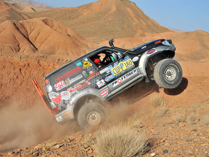 La segunda parte de la etapa, más al sur y con las montañas que marcan la frontera de Argelia a la vista, los competidores terminaron llegando hasta las dunas del Erg Chebbi. En esta etapa la clasificación general dio un vuelco, al “perder” una rueda el Toyota HDJ 80 de los líderes provisionales a unos 60 Km. de pistas de la población de Erfoud, donde el servicio mecánico de la organización tuvo que ir a reparar la avería, llegando ya de noche al taller de Erfoud, pero habiendo perdido sus opciones al triunfo final de la prueba… la CUP 180 es una carrera de fondo, y hasta el último minuto no se sabe quién podrá caer de lo más alto y quién podrá dar “el hachazo” para auparse a alguno de los escalones del podio.